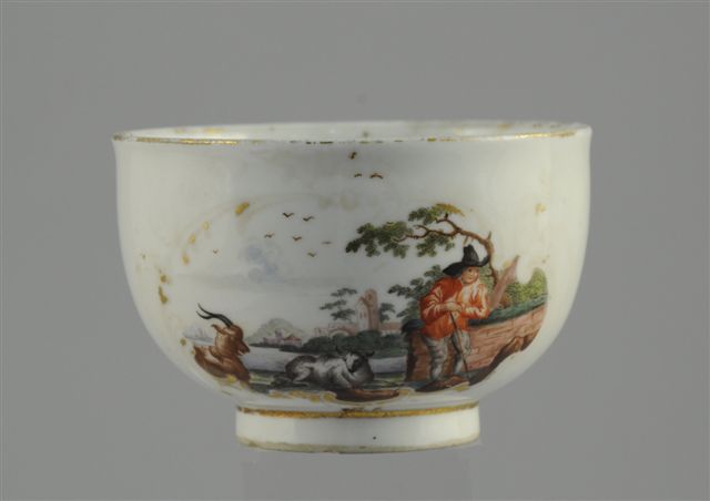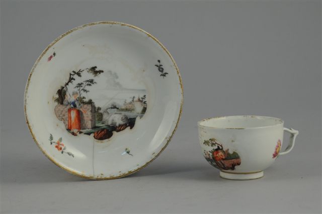 VIENNE (?). TASSE ET SA SOUS-TASSE en porcelaine à décors de bergers et de bergères dans des cartels de rinceaux dorés et de fleurettes ; marques à l'Ecu d'Autriche droit (Manufacture Du Pasquier - 1718-1742)