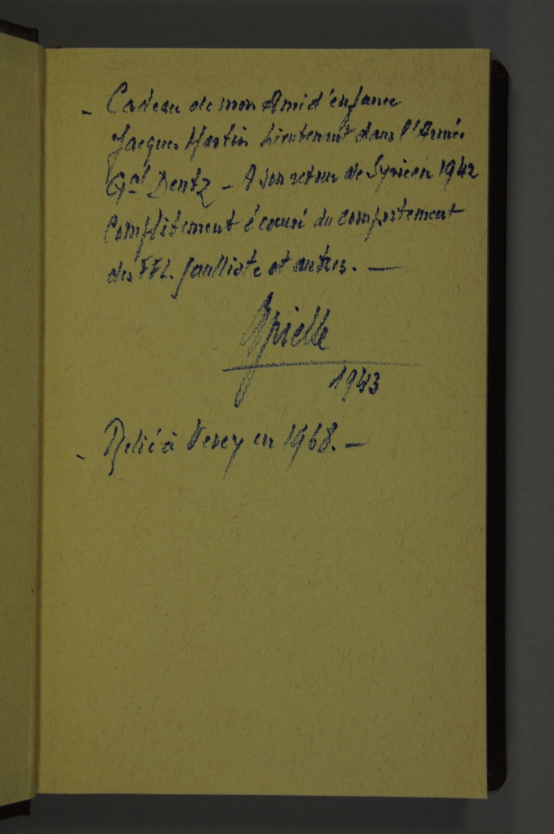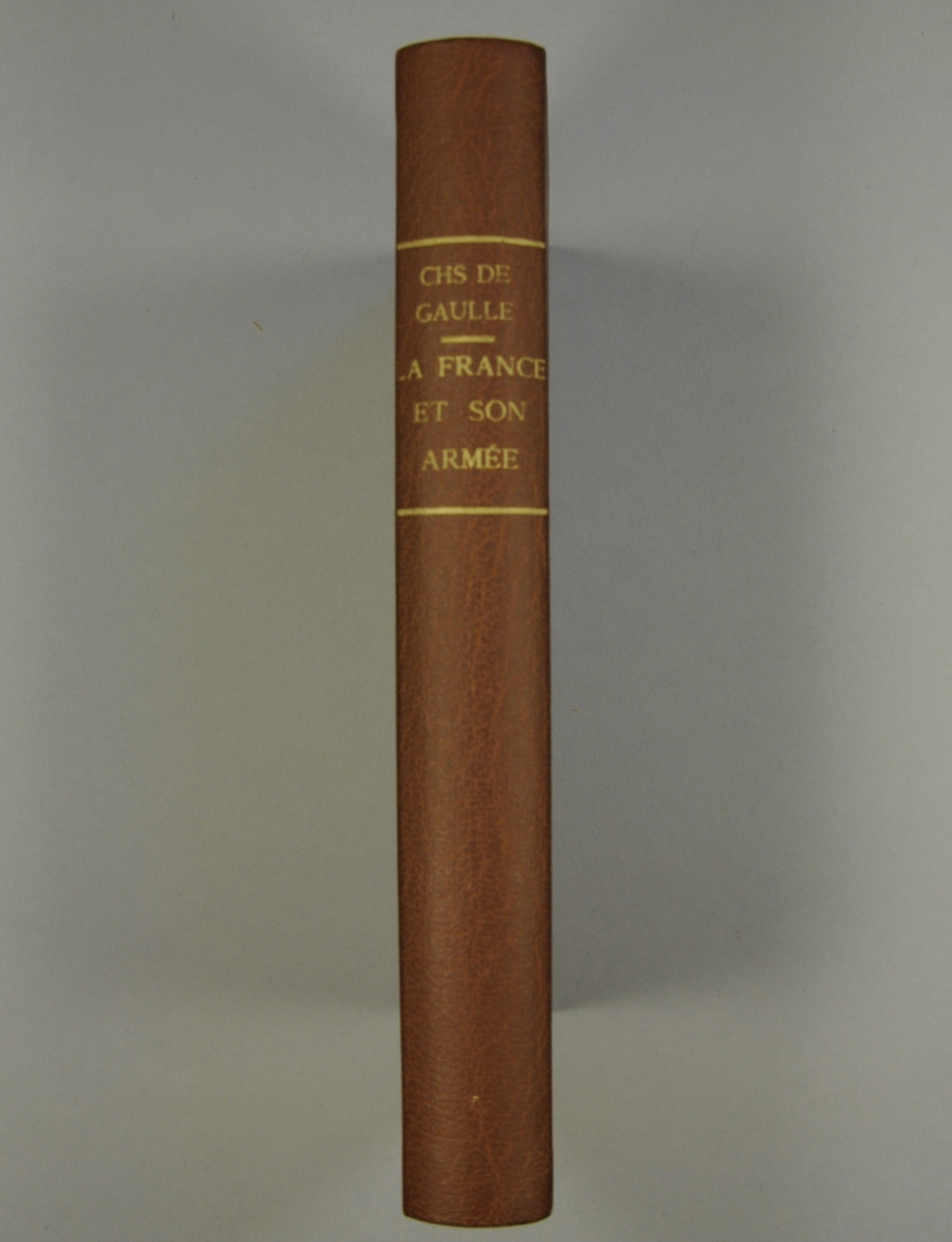 Charles de GAULLE, "La France et son armée", Plon, 1938. Envoi: "- Cadeau de mon Ami d'enfance Jacques Hartin Lieutenant dans l'Armée Gal Deutz - À son retour de Syrie en 1942 Complètement écoeuré du comportement des FFL. gaullistes et autres. 1943".
