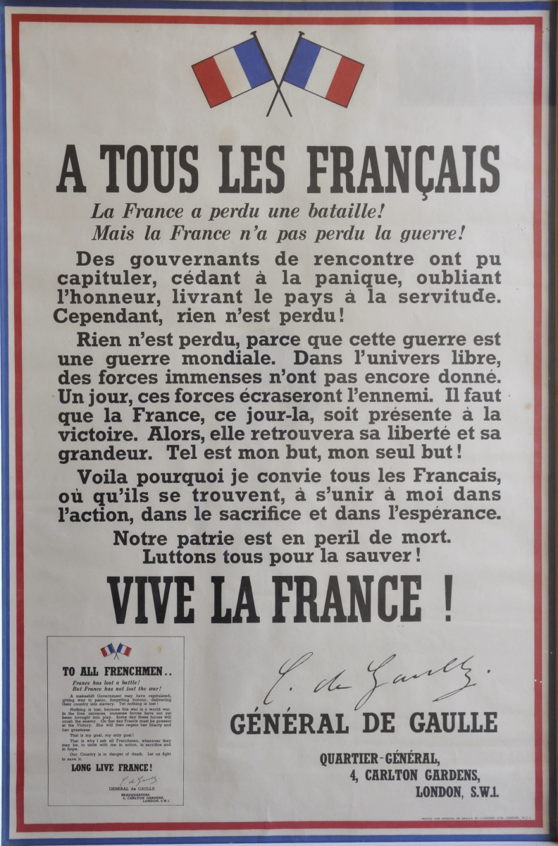 Général de GAULLE (1890-1970). Rare AFFICHE de "L' Appel aux Armes", juin 1940. Le "e" de péril ne porte pas d'accent. L'encadrement tricolore est de type anglais: bleu à l'extérieur, rouge à l'intérieur, avec la mention en bas à droite "PRINTED FOR GENERAL DE GAULLE BY J. WEINER LTD., LONDON, W.C.I.".