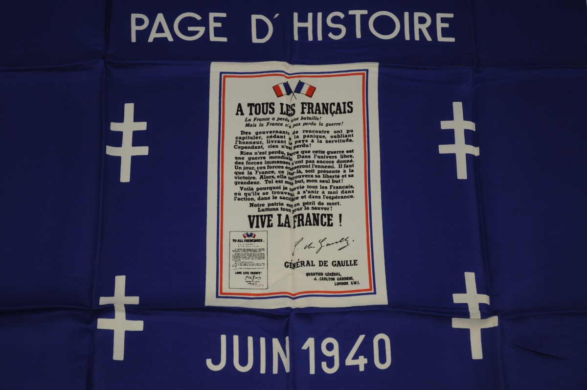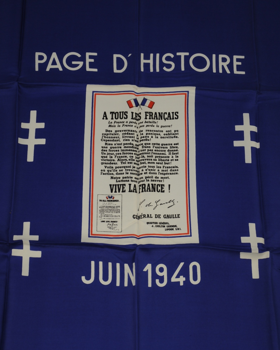 FOULARD DE L'APPEL DU 18 JUIN en soie tricolore. 79 x 79 cm.