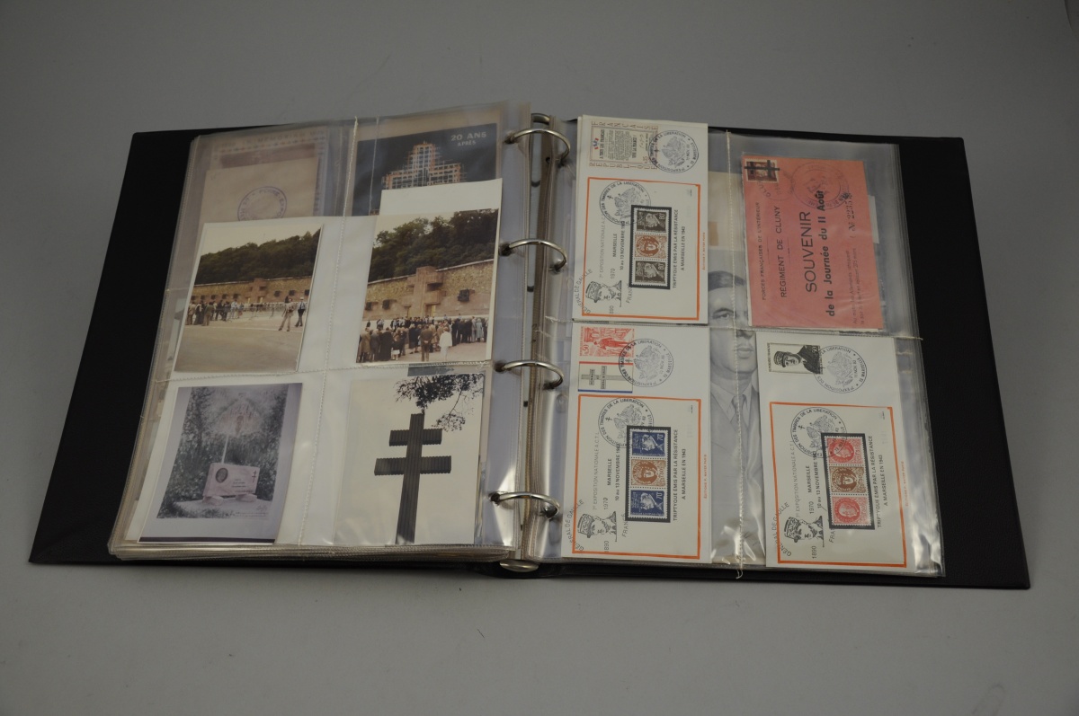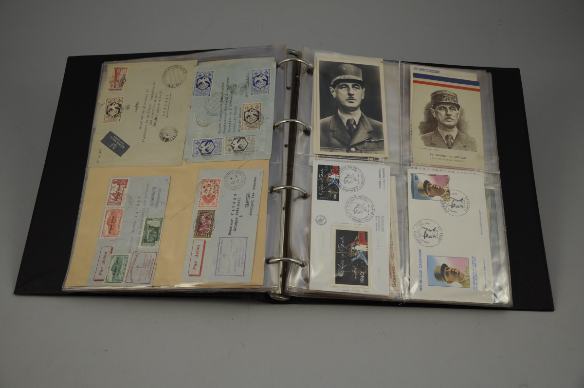 CLASSEUR PHILATÉLIQUE: LE MÉMORIAL DE COLOMBEY. 17 pochettes comprenant cartes postales, photographies de Colombey-les-deux-Églises, enveloppes premier jour, etc.