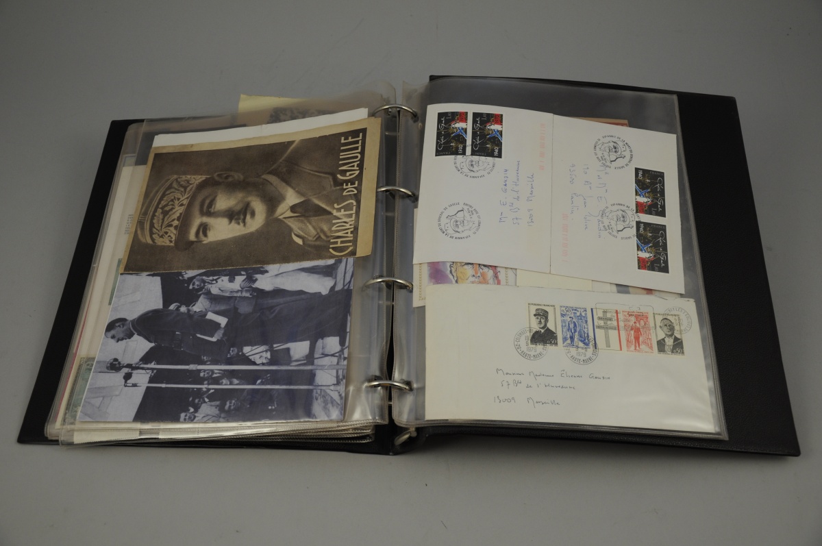 CLASSEUR PHILATÉLIQUE: SOUVENIRS GAULLISTES. 10 pochettes comprenant: cartes postales, photographies de Colombey-les-deux-Églises, timbres, enveloppes premier jour, documents anecdotiques, etc.