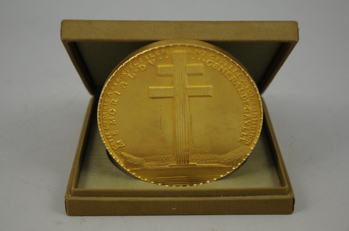 MÉDAILLE COMMÉMORATIVE en bronze doré, Mémorial du Général de Gaulle, signé A. de Jaeger, 1949
