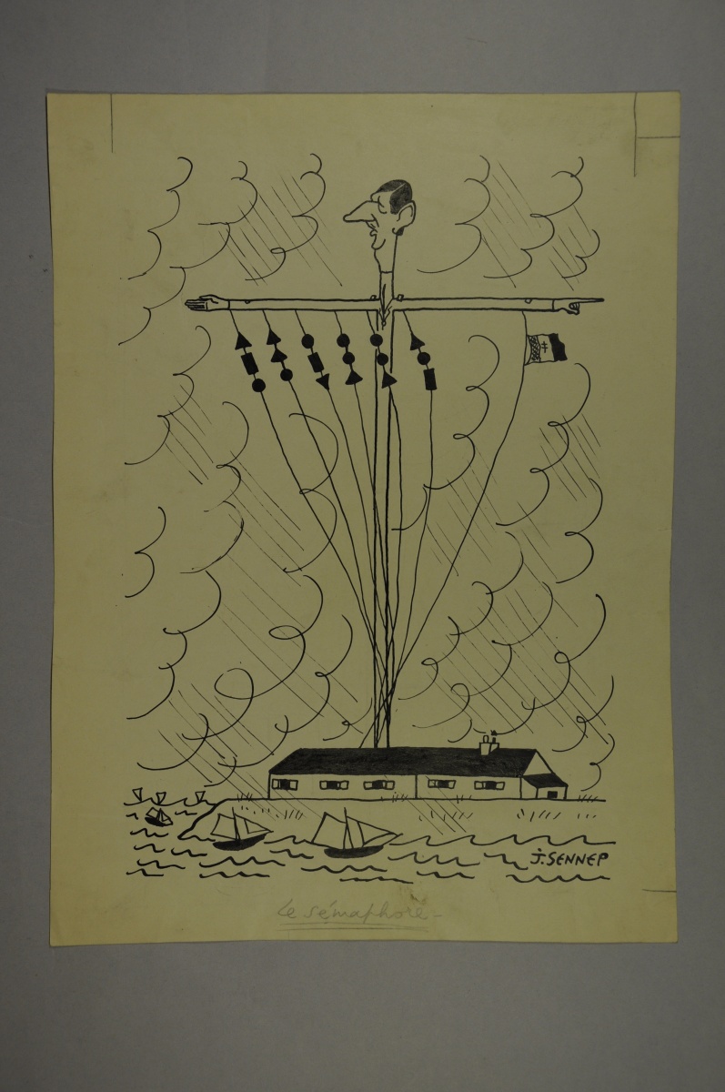 SENNEP. "Le Sémaphore" de Gaulle. Dessin original à l'encre, pour le Front National, 22/23 juillet 1945. Signé et titré. 30,5 x 22,5 cm.