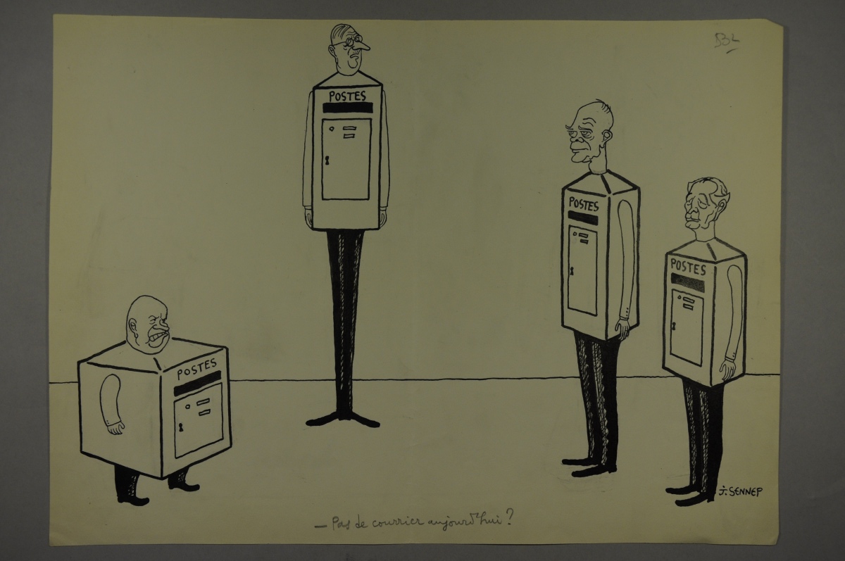 SENNEP. "Pas de courrier aujourd'hui?" de Gaulle, Eisenhower, Mac Millan, Khrouchtchev; Postes. Dessin original à l'encre pour le Figaro du 9/10 août 1958. Signé et légendé. 27 x 37 cm.