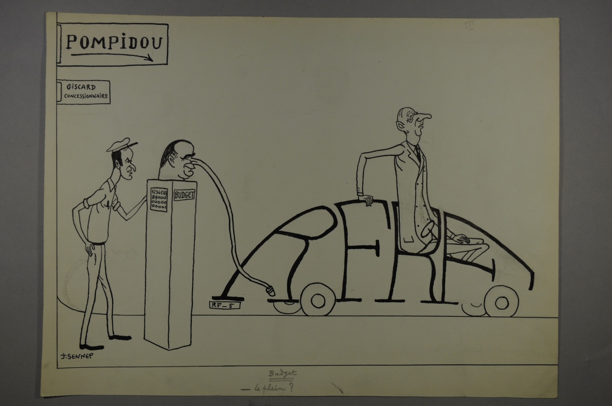 SENNEP. "Budget, le plein?" de Gaulle, Pompidou, Giscard. Dessin original à l'encre pour le Figaro du 15 novembre 1963. Signé et titré. 27 x 36 cm.