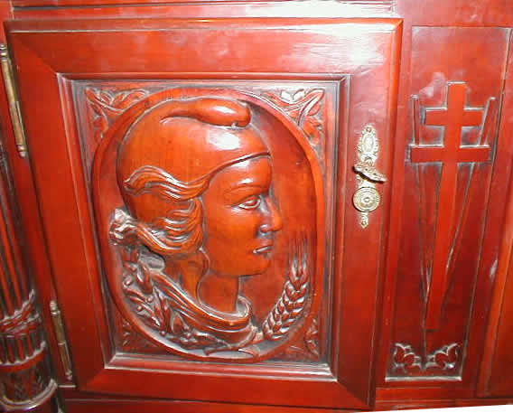Les portes sont ornées de portraits/figures de profil sculptés du Général et de Marianne. Croix de Lorraine sur l'entre deux. Les cotés sont ouvragés de drapeaux surmontés du bonnet phrygien. Les quatre montants sont en faisceaux de licteur.