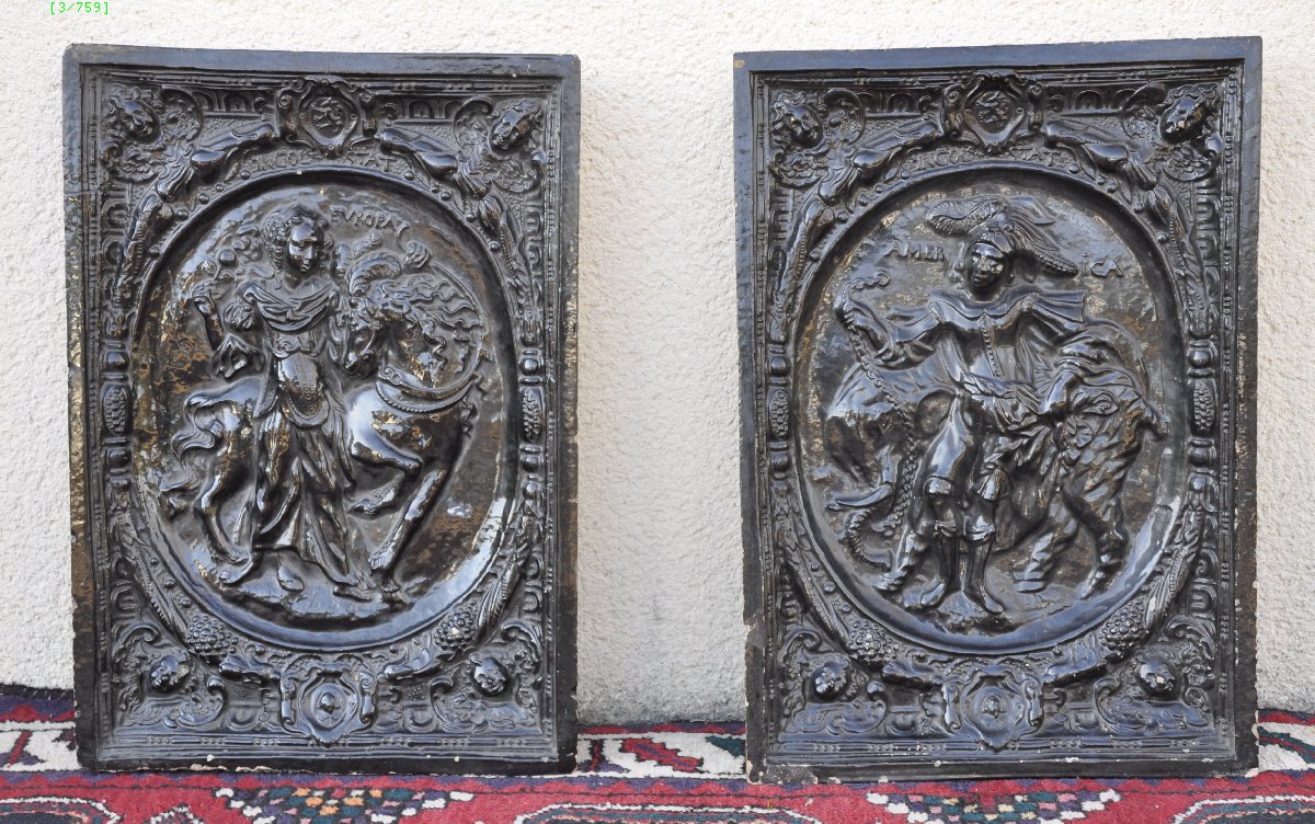 Deux PLAQUES de foyer en terre cuite à glaçure brun foncé. Décor en relief d'allégories des continents, une femme tenant un cheval pour "EUROPA", et un personnage tenant un éléphant pour "AMERICA". Têtes d'angelots dans les écoinçons. Portent la mention "Ingol stat " (pour Ingolstadt?).