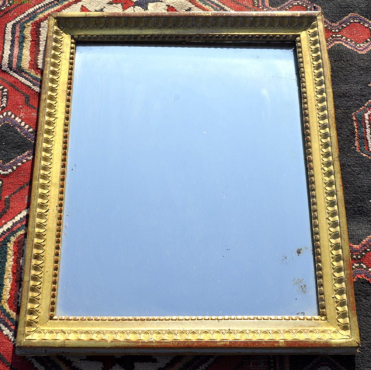 MIROIR de forme rectangulaire en bois stuqué et doré. Cadre orné de feuilles d'eau à l'extérieur et d'une frise de perles à la vue.