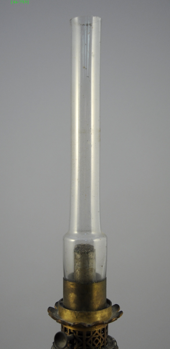 LAMPE À PÉTROLE. Fût en porcelaine chinoise à décor de scènes animées dans des paysages, sur fond d'entrelacs dorés et de fleurs rouges et bleues. Monture de bronze doré de style rocaille. Avec verre ancien.