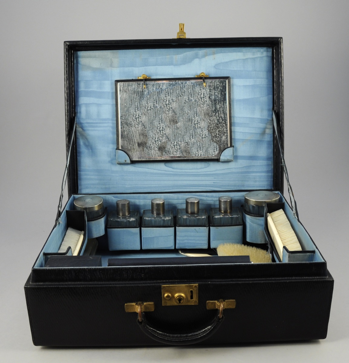 NÉCESSAIRE DE TOILETTE dans sa valise gainée de cuir noir et garnie de moire bleue. Il comprend: