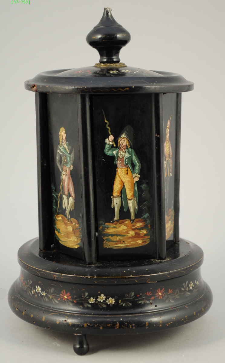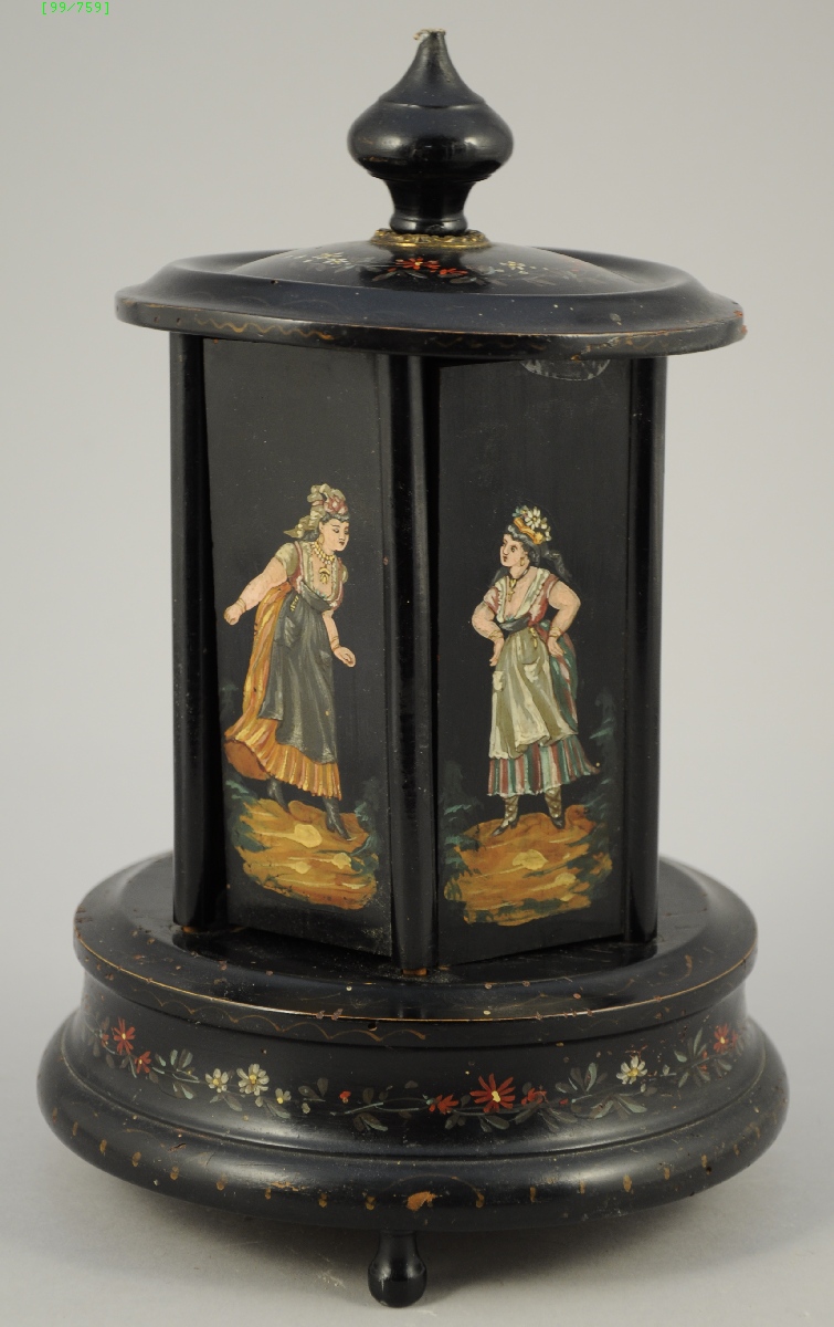 CAVE À CIGARES en forme de kiosque en bois noirci, et peint de merveilleuses et d'incroyables, ainsi que de fleurettes. La prise supérieure permet l'ouverture des différentes portes garnies de présentoirs à cigares en métal doré.