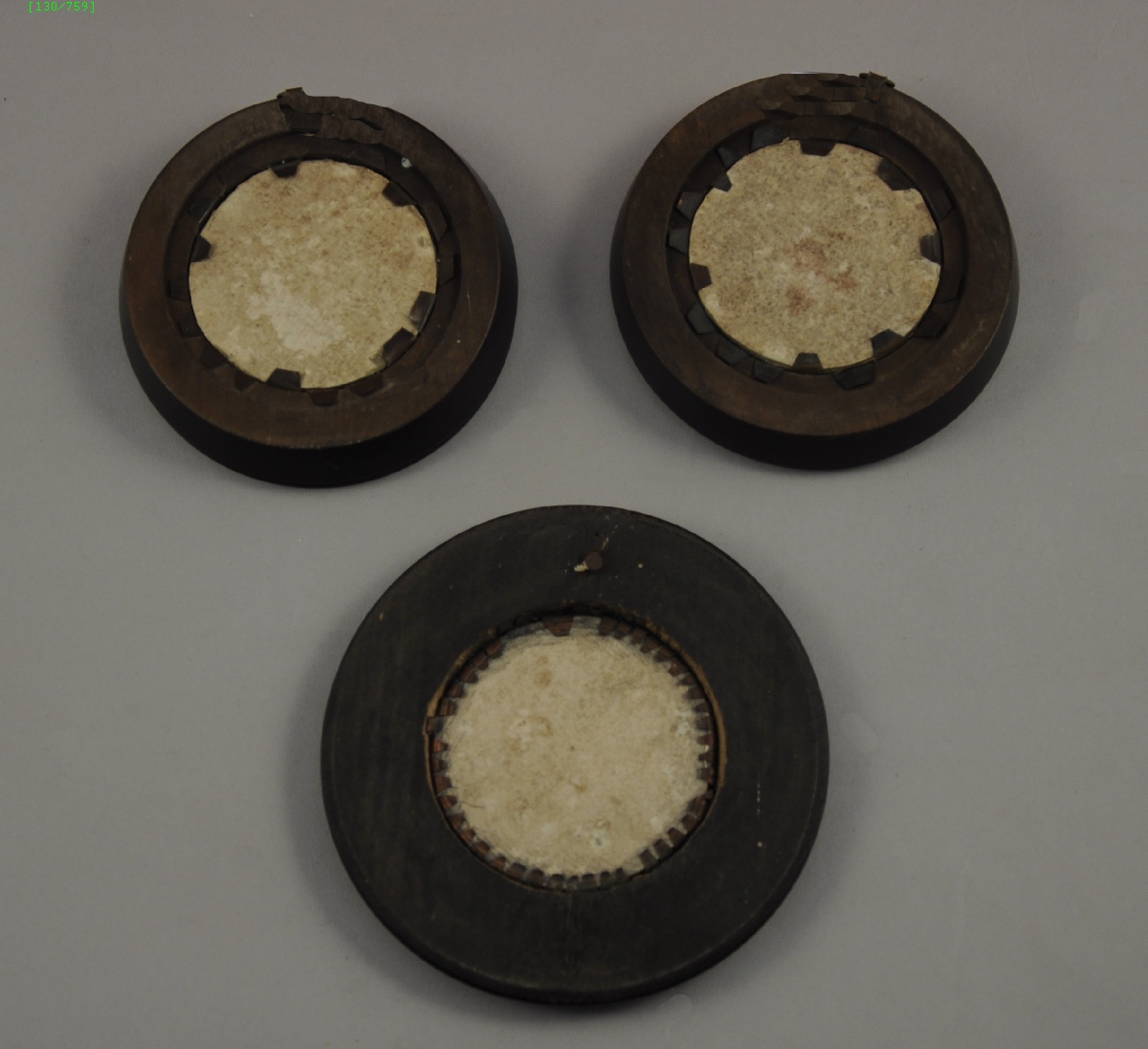 Cadres de bois noirci avec bordures de laiton doré. Diam. 6,5 cm.
