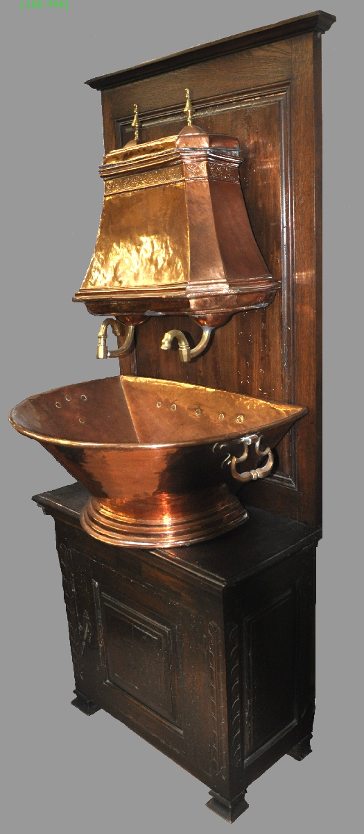 FONTAINE en cuivre. Réserve d'eau de forme évasée, ornée sous le couvercle d'une frise de motifs géométriques. Robinets et prises du couvercle en laiton ouvragé. Bassin évasé, reposant sur un piédouche en escalier, avec deux anses mobiles de part et d'autre.