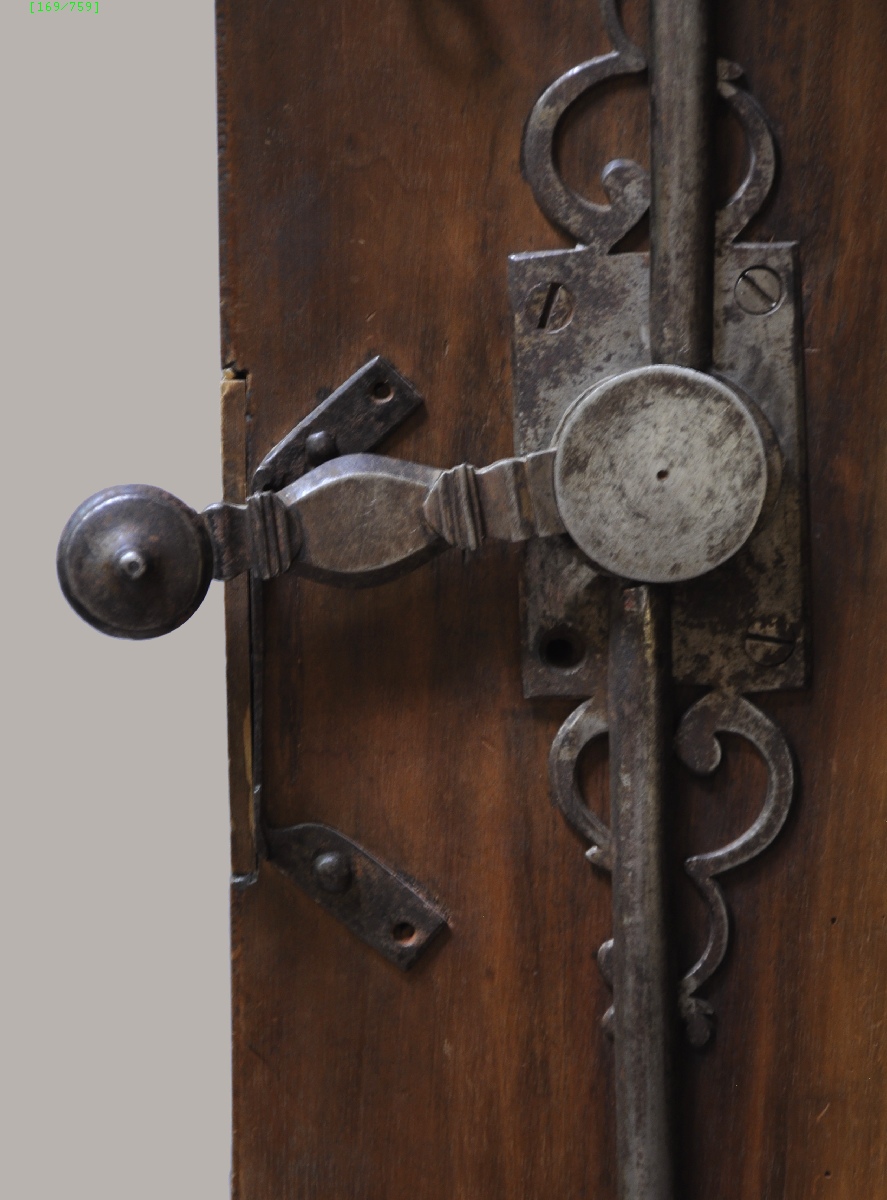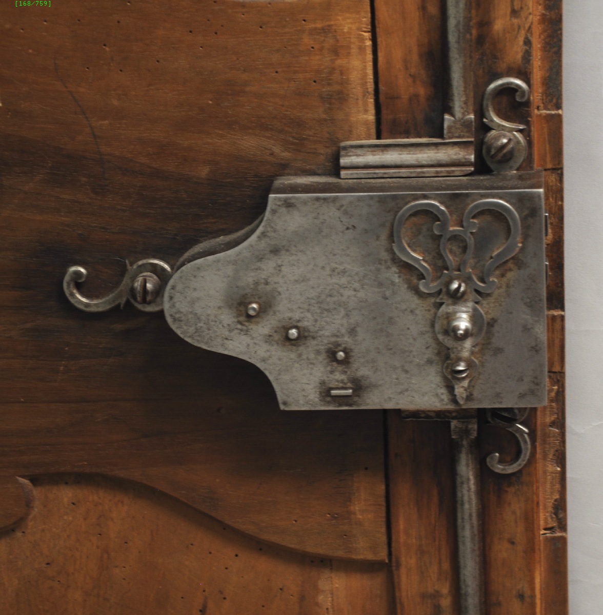 Grande ARMOIRE en noyer mouluré et sculpté. Partie supérieure à chapeau de gendarme. Elle ouvre par deux vantaux à trois panneaux moulurés, celui du centre en forme de cur et orné de fleurettes. Traverse supérieure et faux-dormant à décor de fleurs. Traverse inférieure chantournée et sculptée d'une coquille. Repose sur de petits pieds cambrés en escargot. Côtés panneautés. Garnitures de fer forgé ; belle serrure ouvragée à longs pennes.