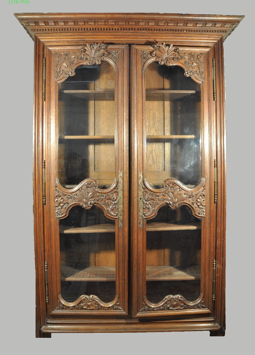 BIBLIOTHÈQUE en chêne mouluré. Portes et partie supérieure des côtés vitrées. Ornementation sculptée de fleurs, coquilles et palmes.