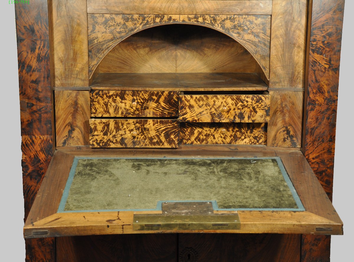 SECRÉTAIRE à abattant en placage d'acajou rayonné. Il ouvre par un grand tiroir en partie supérieure. L'abattant, foncé d'un velours vert, découvre un intérieur en placage de bois clair, garni de quatre tiroirs, surmontés d'un casier en demi-lune, et de deux tiroirs dissimulés, ouvrant par un mécanisme à ressort. Deux portes en partie inférieure. Entrées de serrure en bronze, à décor de guirlandes de feuilles et de fleurs.