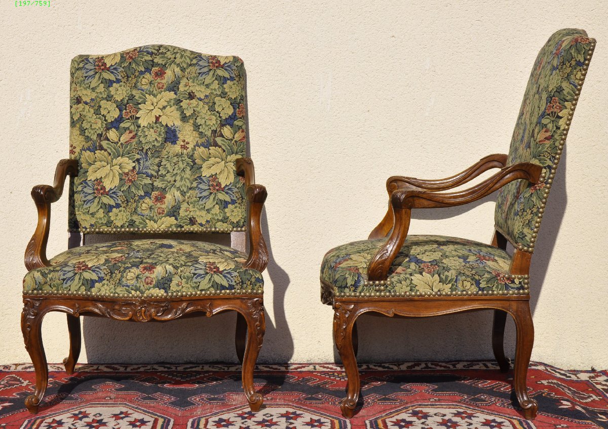 Paire de FAUTEUILS à la Reine en noyer mouluré et sculpté. Accotoirs en retrait. Décor de palmes et coquilles. Extrémité des pieds en enroulement.