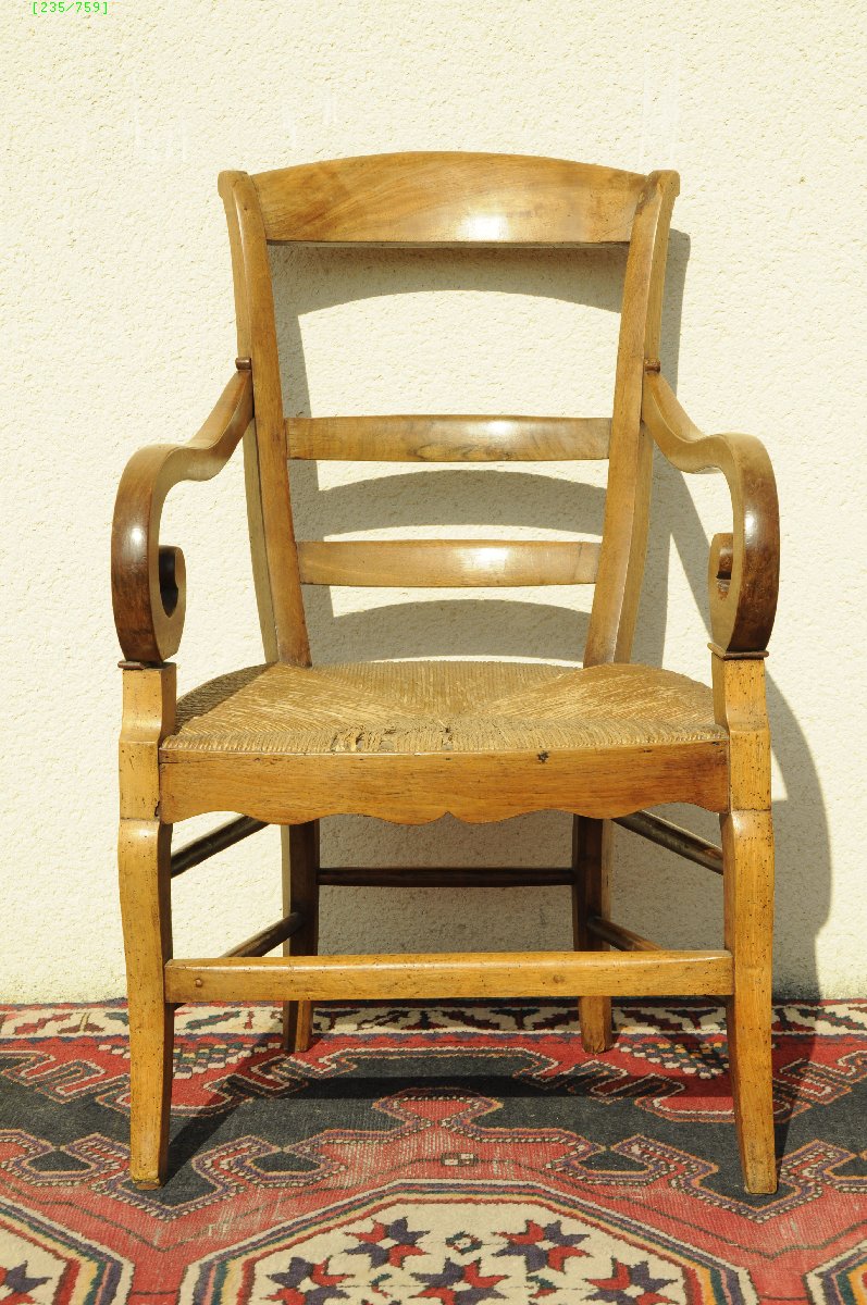 FAUTEUIL en noyer, dit "cadot". Accotoirs en crosse. Assise foncée de paille.