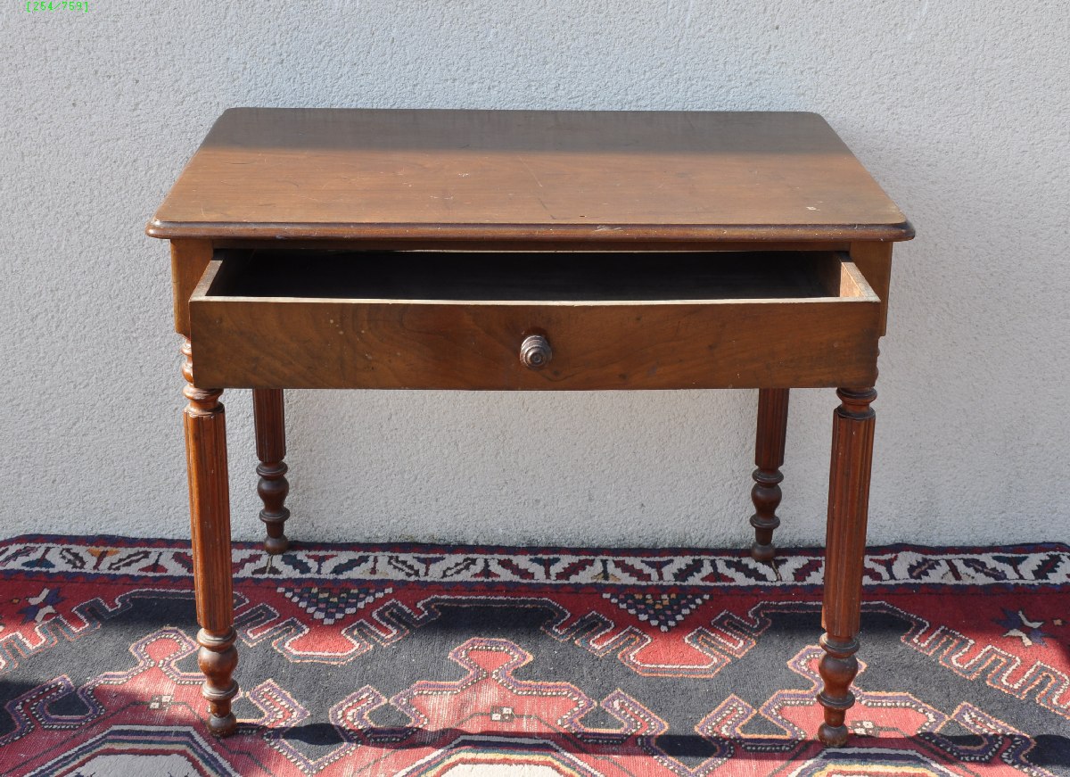 TABLE-BUREAU en acajou et placage d'acajou. Elle ouvre par un large tiroir en ceinture et repose sur quatre pieds tournés.