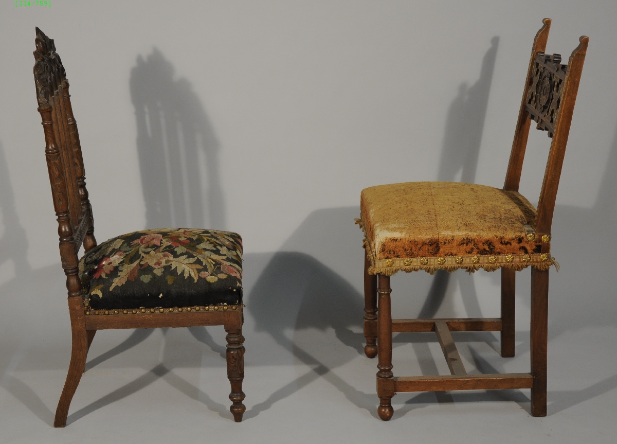Joint: CHAISE en noyer à dossier sculpté de motifs de cuirs découpés. Style Henri II, fin XIXe. Haut. 88, Larg. 45, Prof. 44 cm.