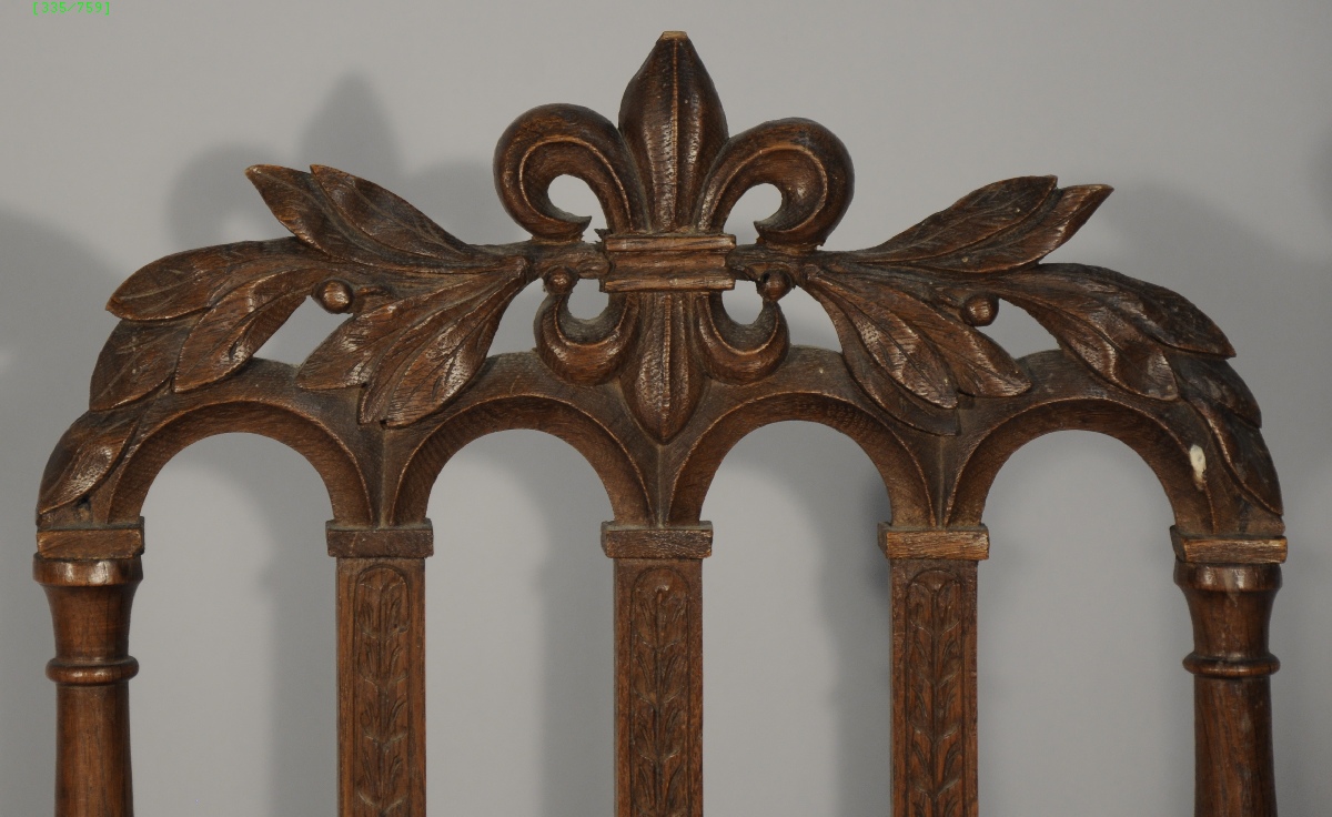 CHAUFFEUSE en chêne. Dossier à quatre arcades reposant sur des colonnettes ornées de palmes, surmonté d'une fleur de lys entre deux rameaux. Pieds antérieurs tournés et sculptés de feuilles.