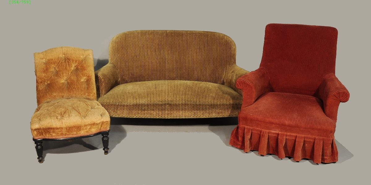 Garniture de velours jaune à côtes (usée). Haut. 87, Larg. 151, Prof. 73 cm.