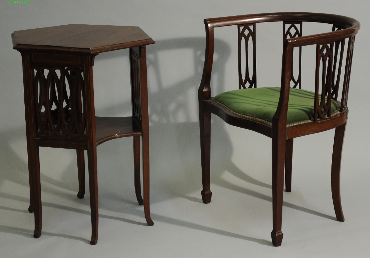 TABLE de salon et FAUTEUIL en acajou et filets de bois clair. La table à plateau hexagonal, tablette d'entrejambe et cloisons ajourées. Le fauteuil à pieds antérieurs droits et fuselés, pieds postérieurs en sabre et assise garnie de velours vert.
