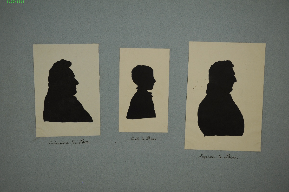 Trois PORTRAITS "en ombre", ou "à la silhouette", à la gouache, sur papiers blancs contrecollés sur une feuille de papier bleu, où sont inscrits à l'encre le nom des personnages représentés: Labeaume de Bez, Emile de Bez, Lagrave de Bez.