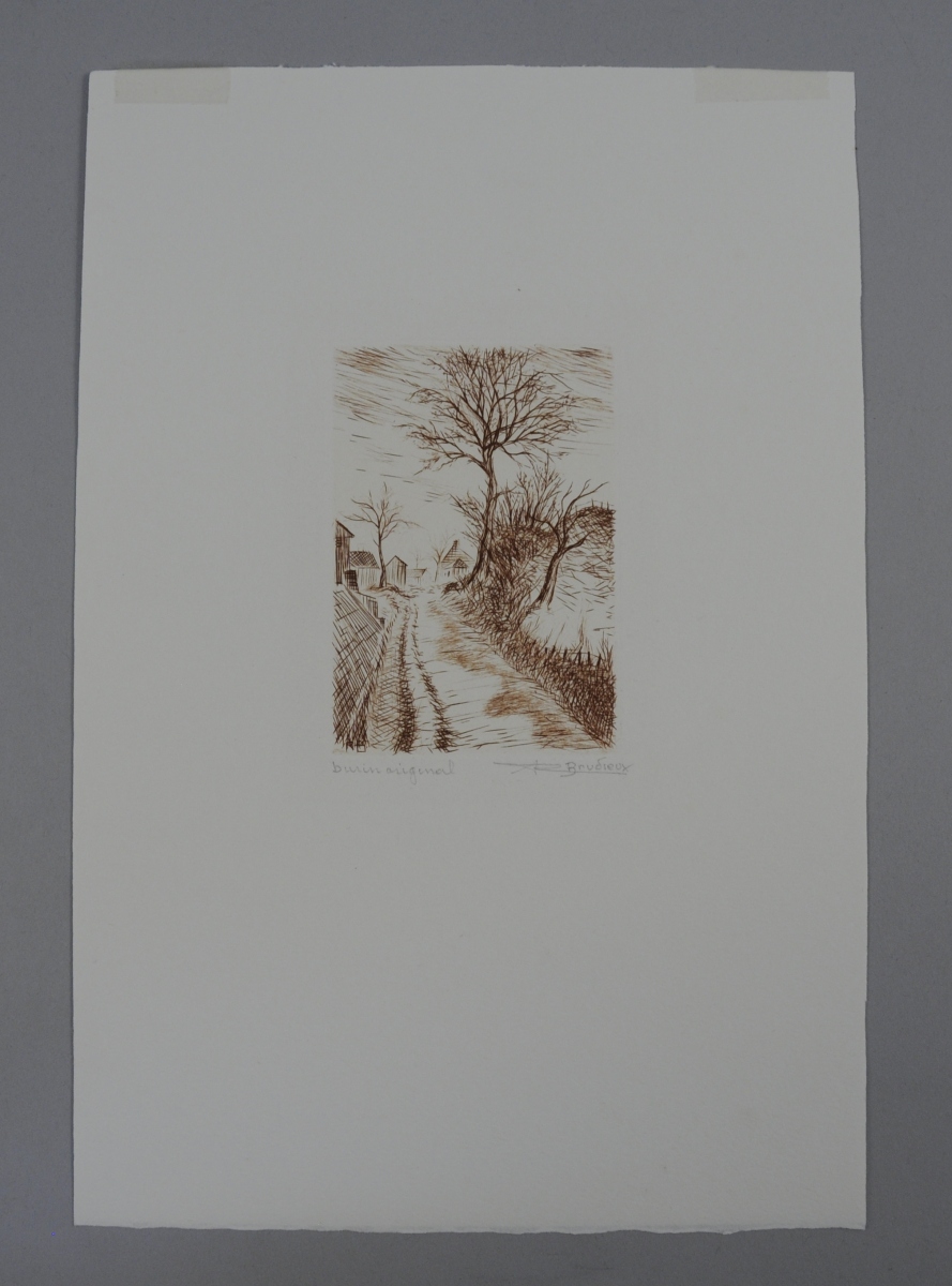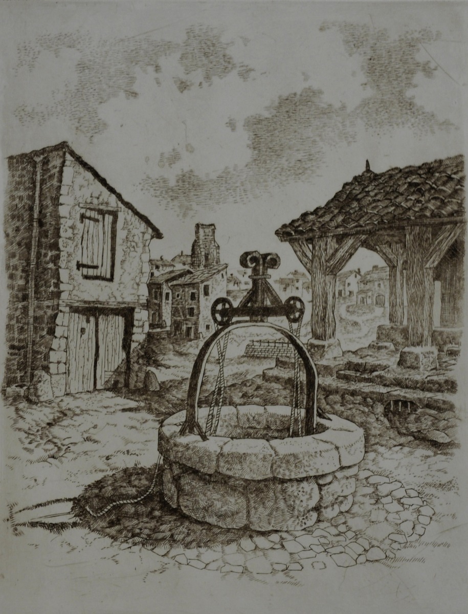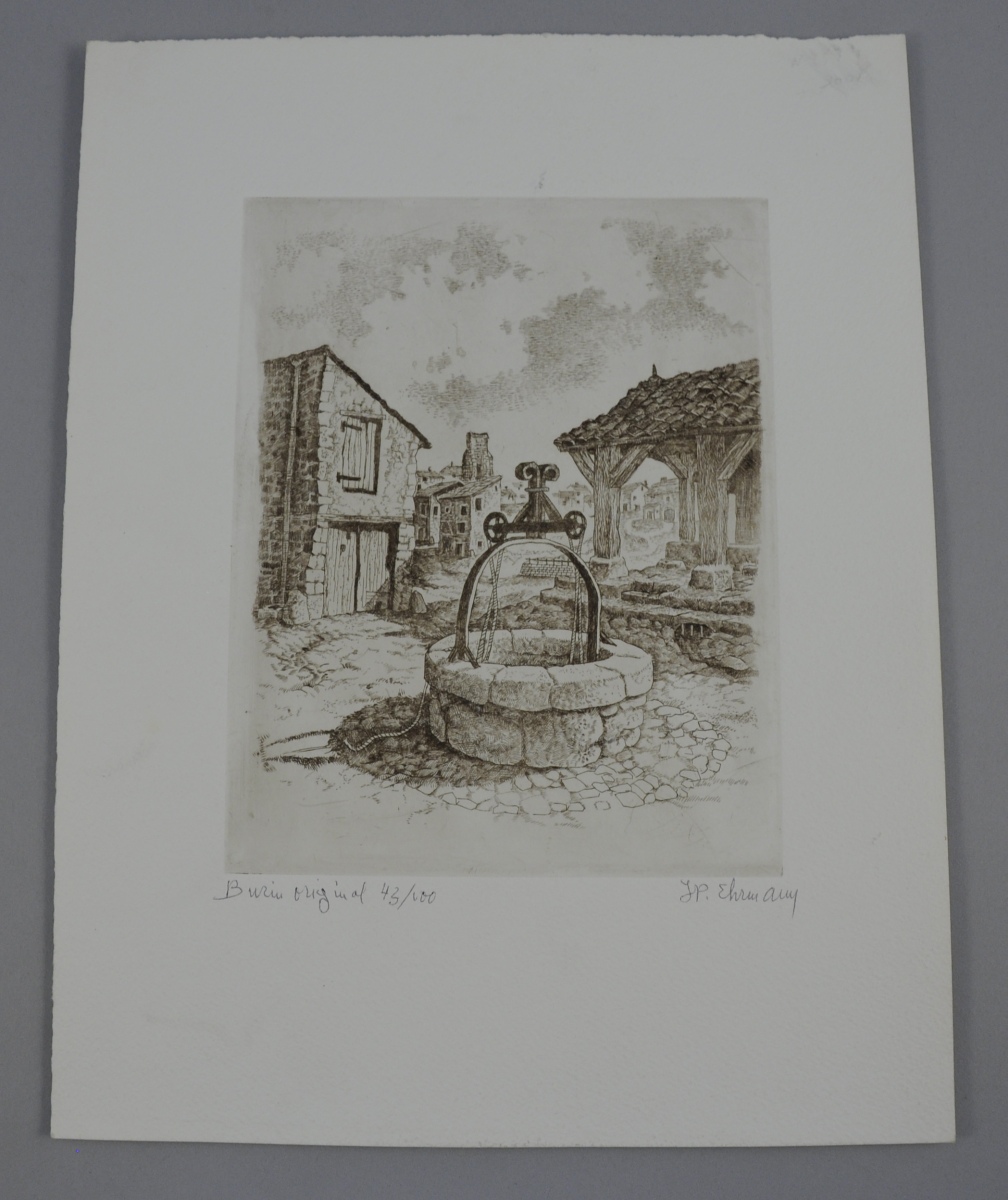-EHRMANN Jean-Paul. 5 gravures au burin figurant des vues de villages, un vanneur et un hibou.