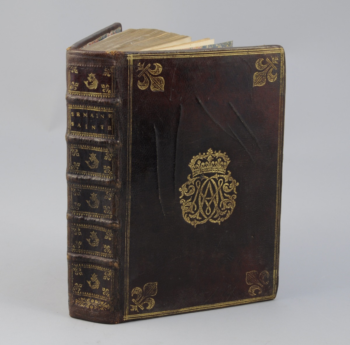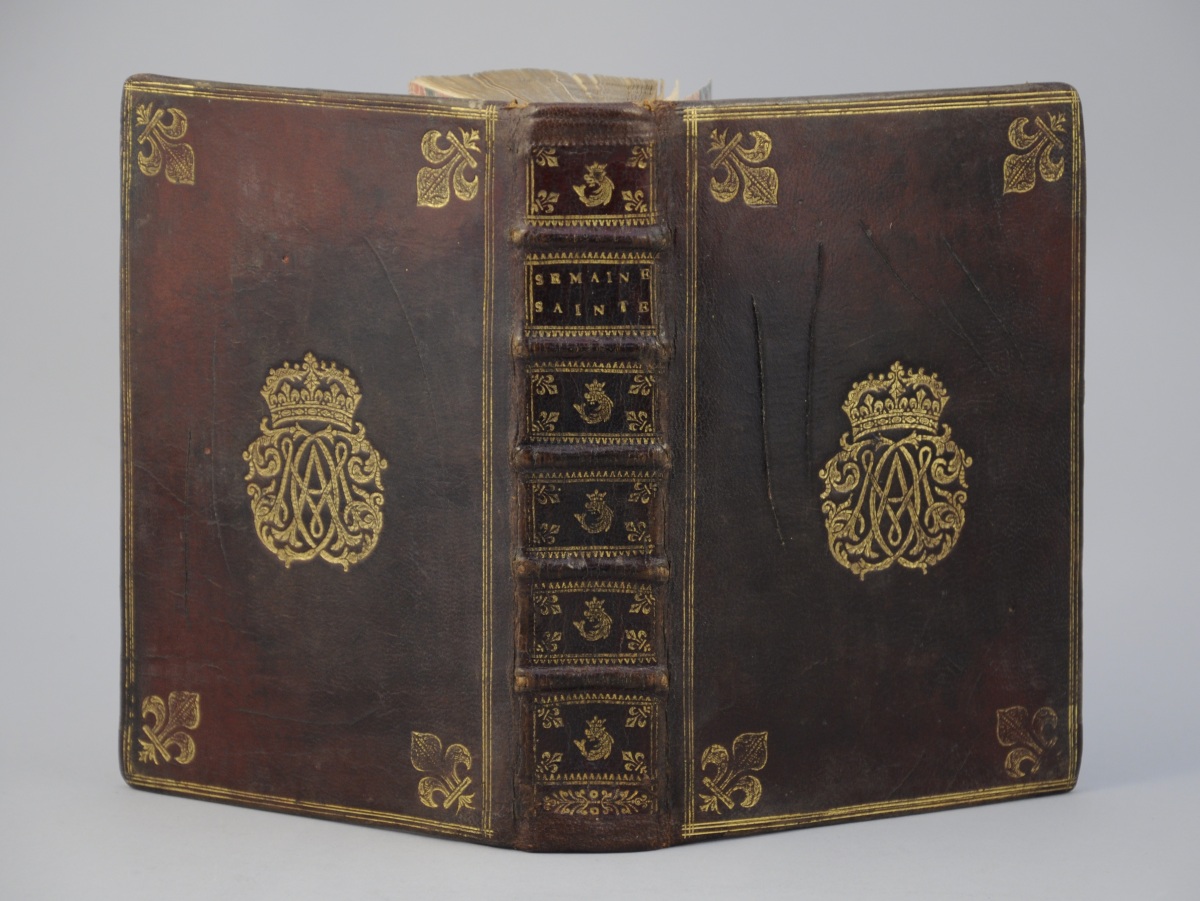 In-8, plein veau rouge, tranches dorées. Chiffre de Marie Anne Christine de Bavière (1660-1690), Dauphine de France, épouse du Grand Dauphin, au centre des plats ; fleurs de lys en angle.. (Accidents sur le plat supérieur. Mouillures. Cachet gras sur le titre).