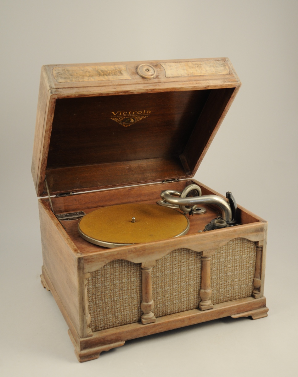 GRAMOPHONE de marque VICTROLA dans son coffret de bois avec des jeux d'aiguilles et sa manivelle. Plaque en métal indiquant:"Victor Talking Machine Co. Camden New Jersey U.S.A. VV1-70, 5174".
