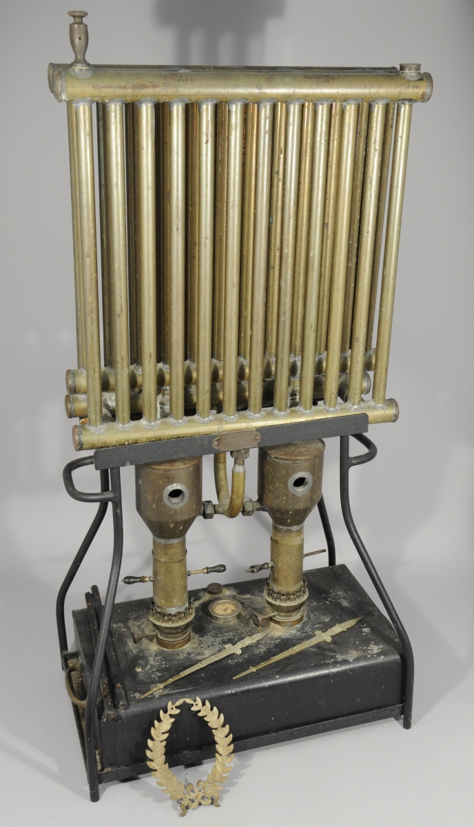 APPAREIL de CHAUFFAGE à deux feux de lampe a pétrole et trois rangs de tube en laiton pour l'eau. Il repose sur une base en tôle noire, avec poignées latérales. Ornementation de style Empire.