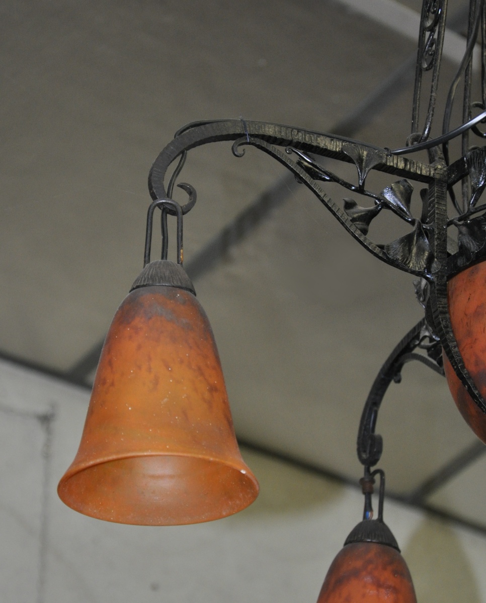 LUSTRE en fer forgé à quatre bras de lumière. Vasque centrale et quatre tulipes en verre marmoréen orange nuancé mauve. L'armature laquée noir à décor naturaliste ajouré de feuilles de ginkgo biloba. Les pièces de verre signées "Daum / Nancy / France".