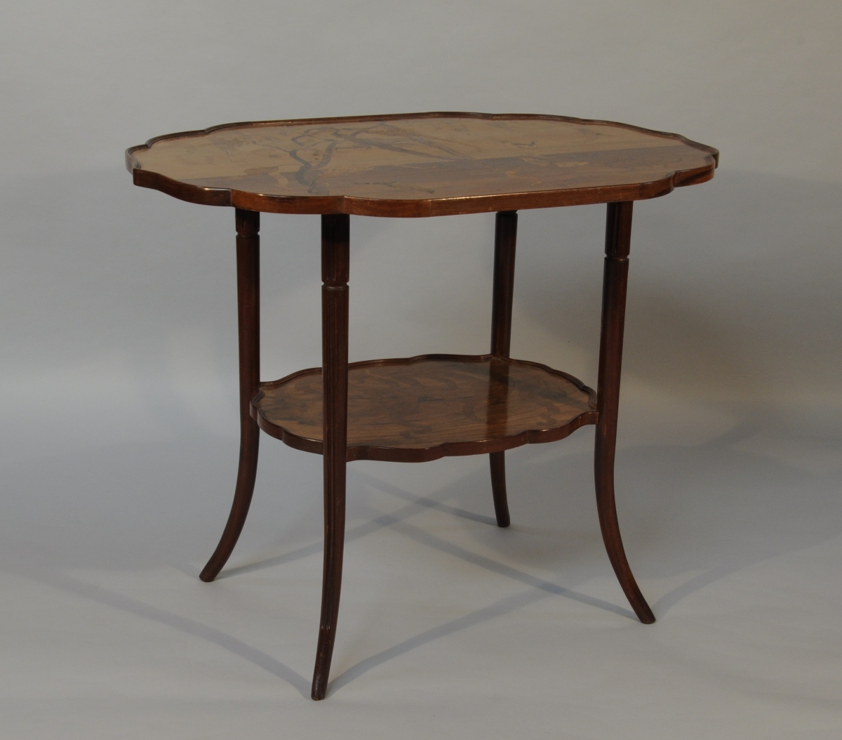 Émile GALLÉ (1846-1904). TABLE À THÉ en marqueterie à deux plateaux à décor de papillons sur fond de branchages fleuris. Quatre pieds à l'imitation du bambou.