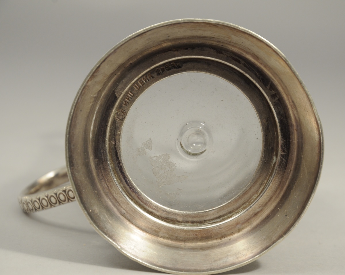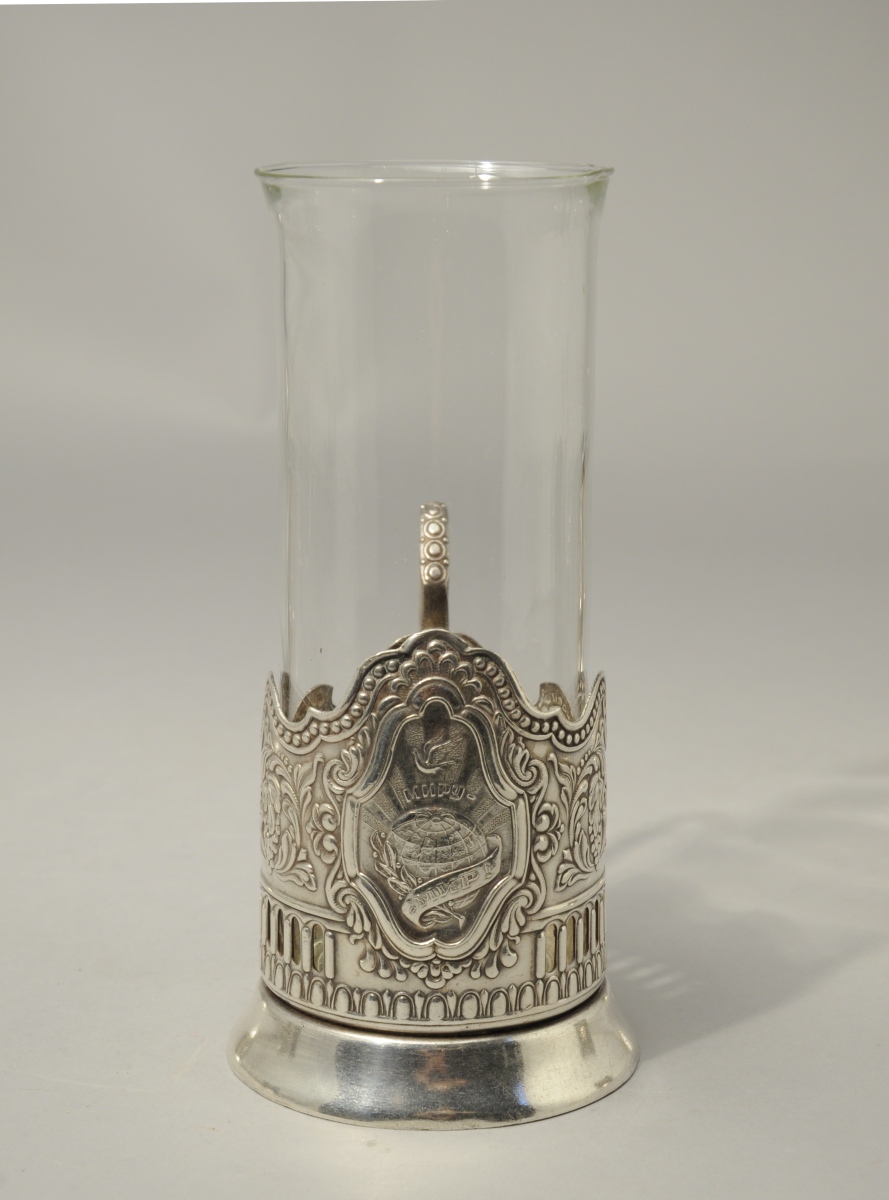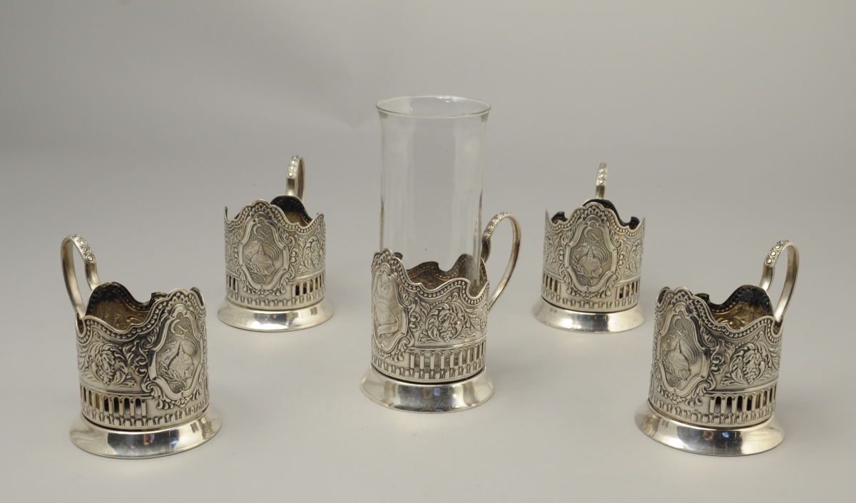 5 PORTE-VERRES en métal argenté des TRAINS SOVIÉTIQUES, l'un figurant une allégorie de la paix, les quatre autres magnifiant les exploits spatiaux russes avec représentation du spoutnik et des fusées intercontinentales.
