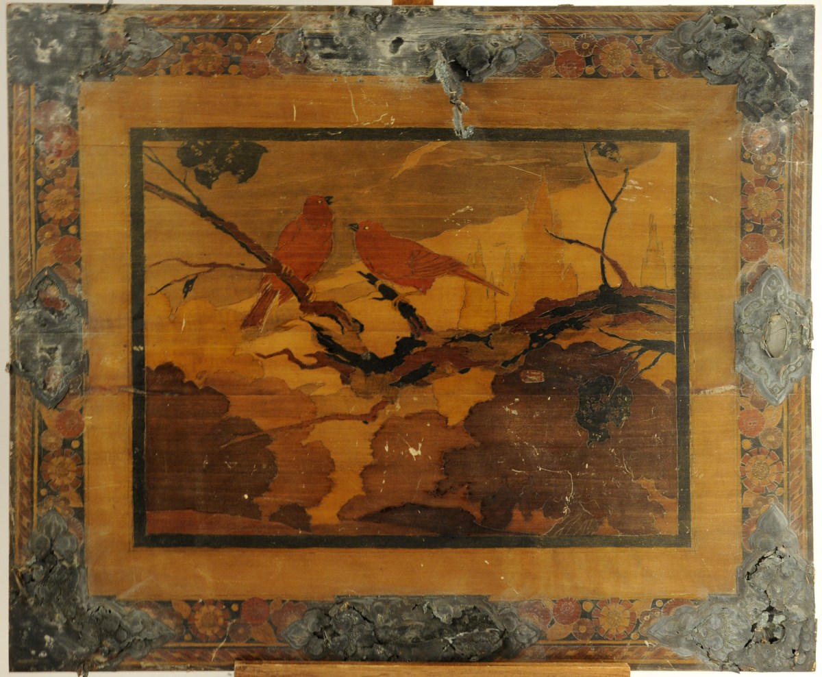 Panneau en marqueterie de bois d'essences variées figurant deux passereaux sur fond paysagé. Encadrement de frises de fleurs stylisées et torsades agrémenté de plaques de pomponne repoussé.