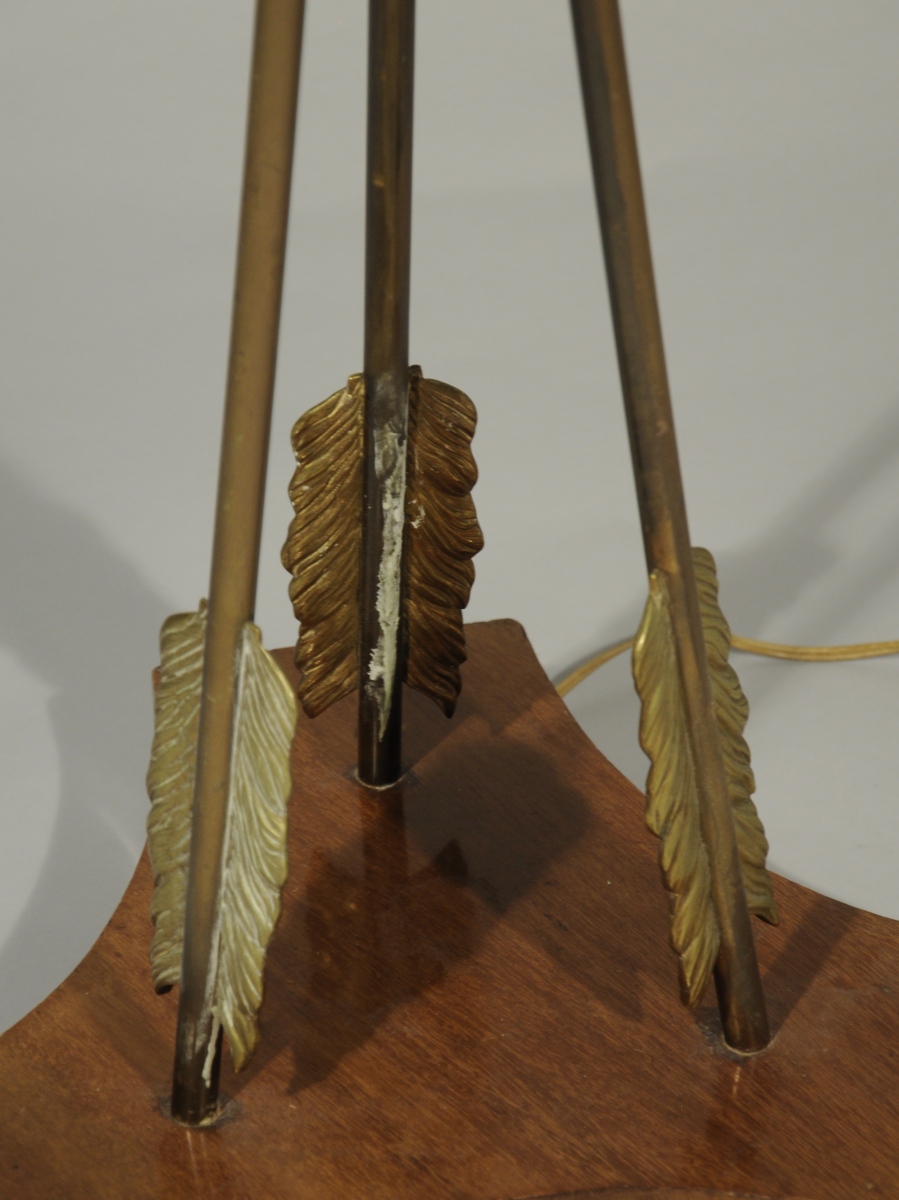 - LAMPADAIRE en laiton. Le fût formé de trois flèches entrecroisées. Socle en bois.
