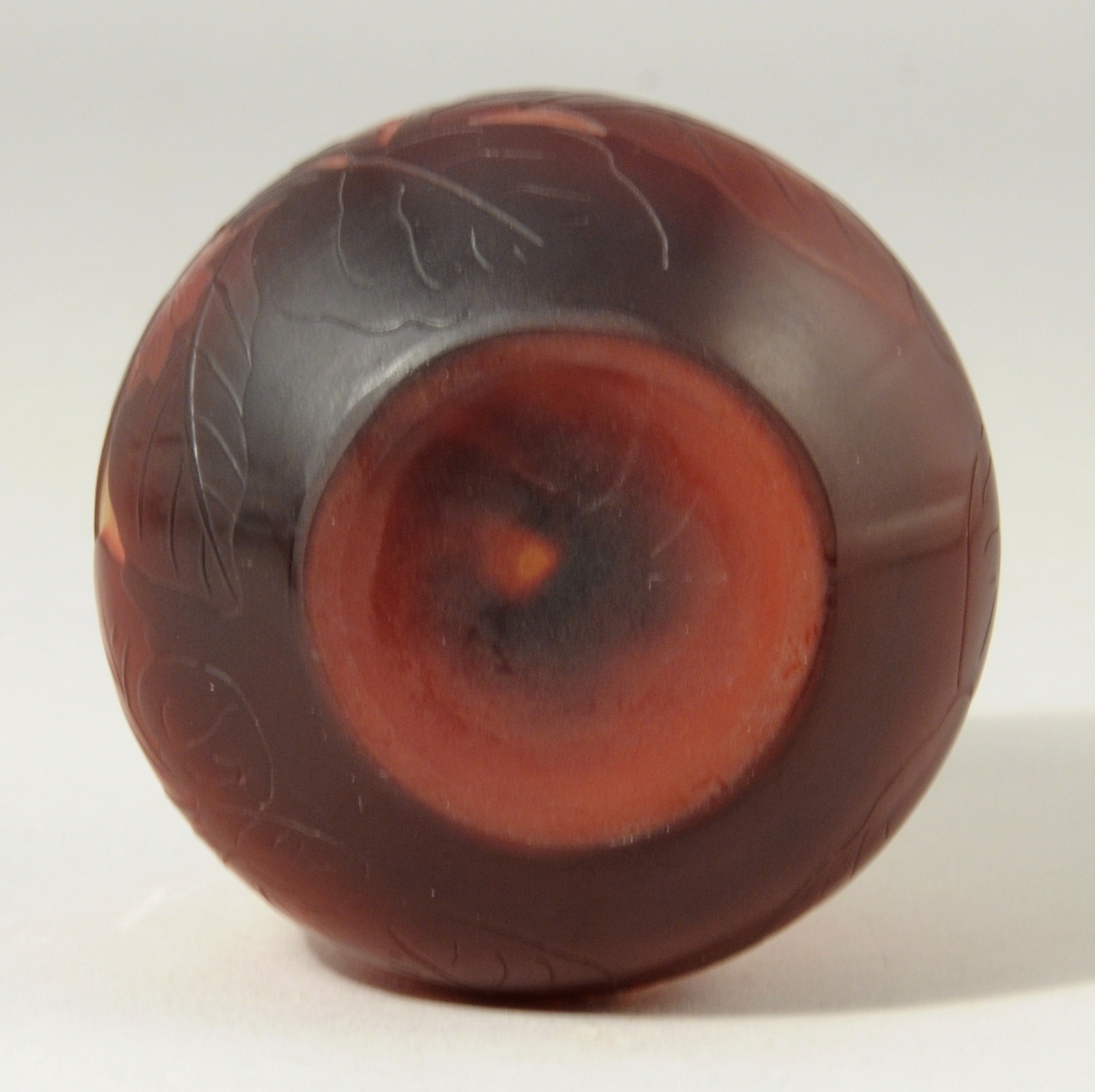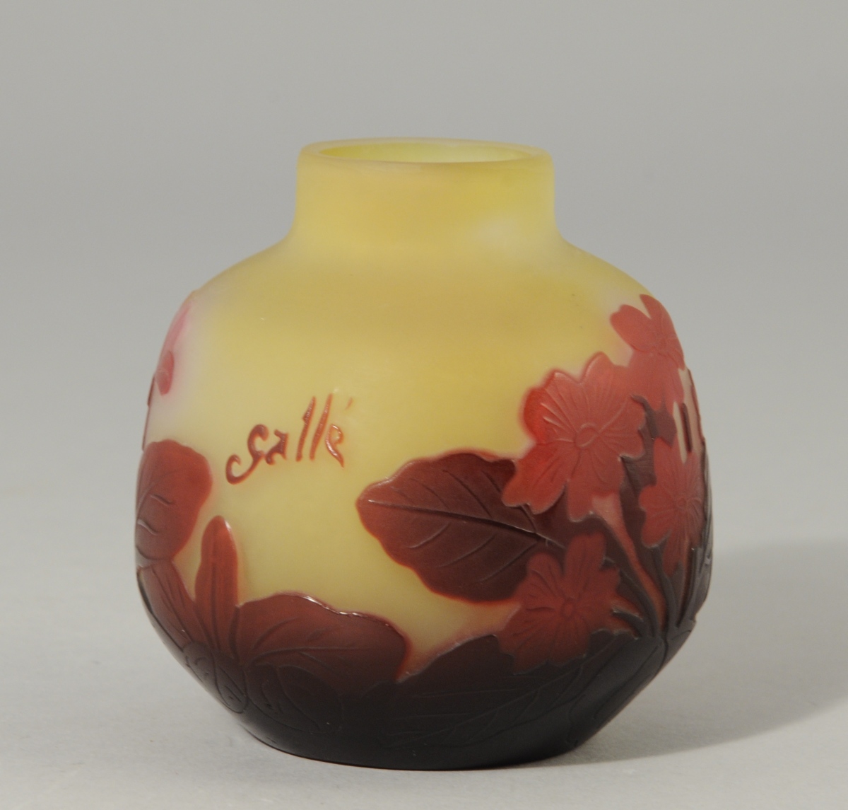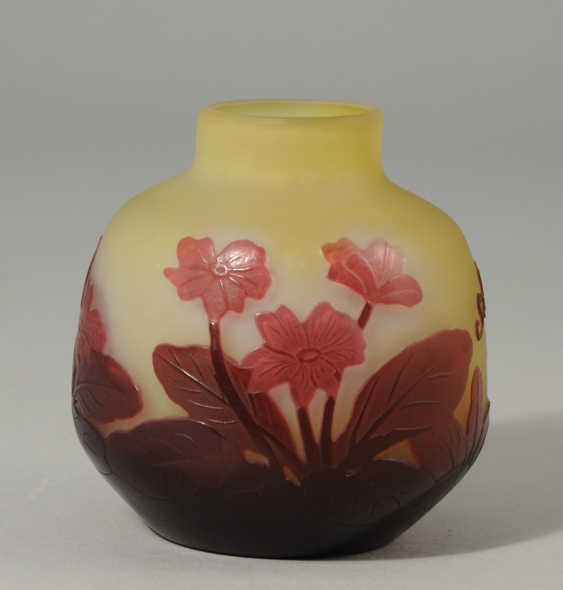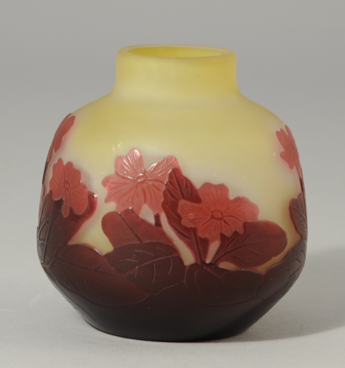 Émile GALLÉ (1846 -1904). VASE boulle à léger col en pâte de verre à décor de feuillages et de fleurs de couleur prune dégagés à l'acide sur fond jaune. Signé.