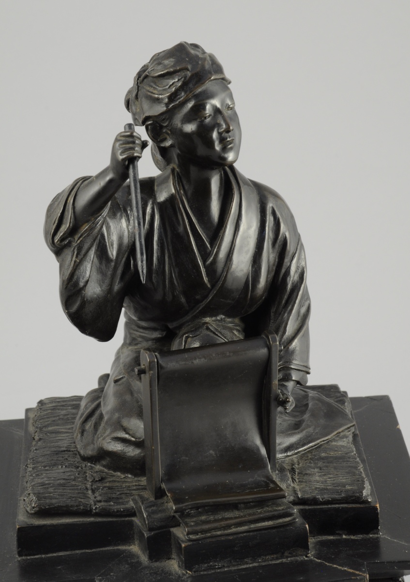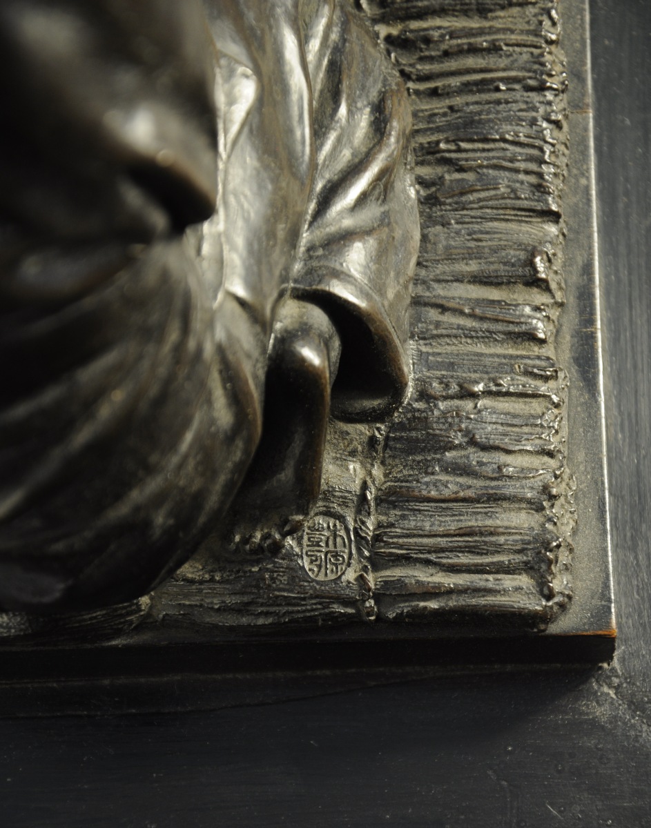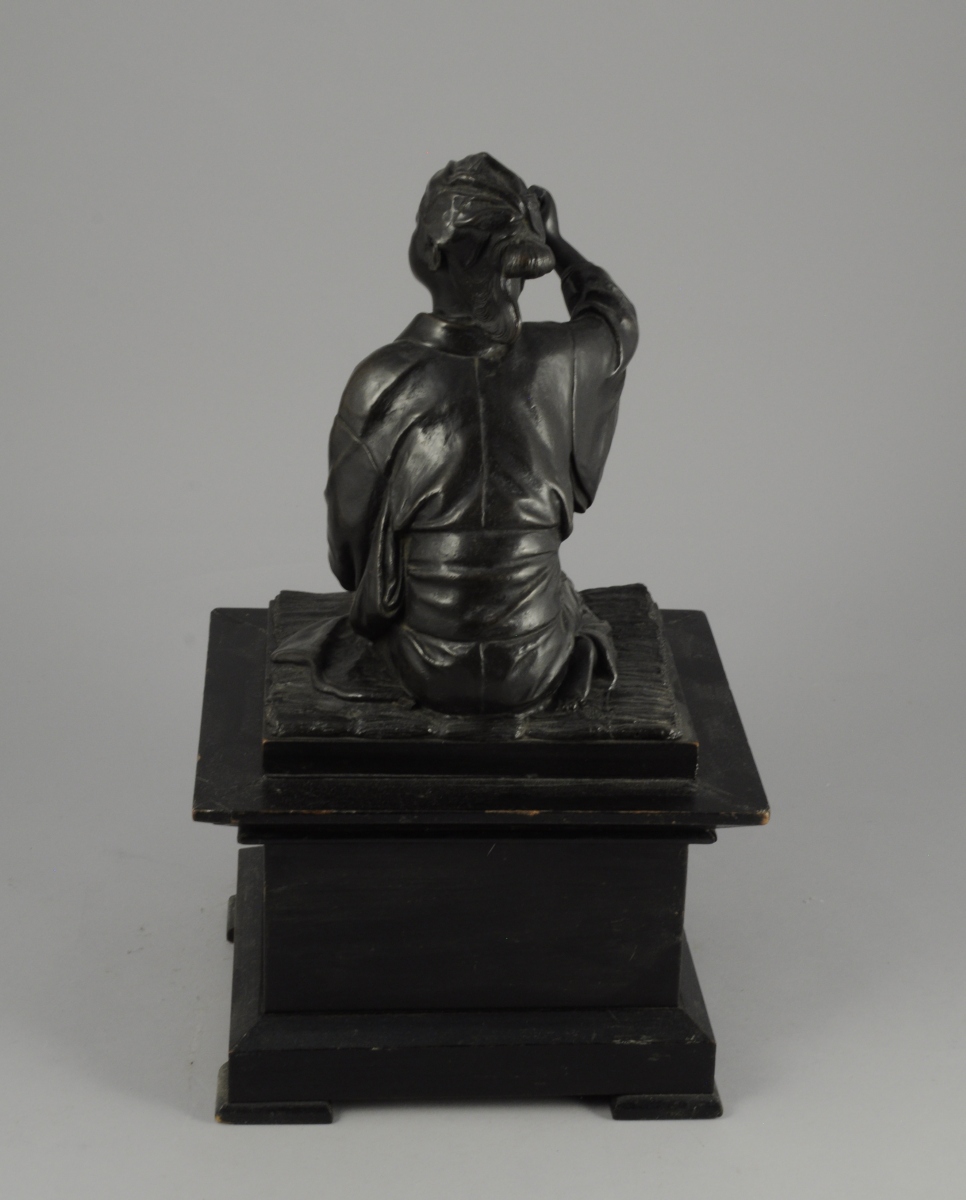 JAPON. PEINTRE ACCROUPI, en bronze à patine brune sur un socle en bois. XIXe.