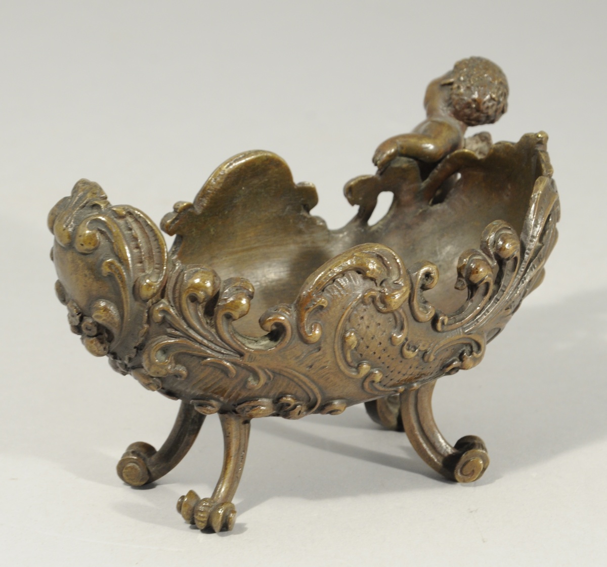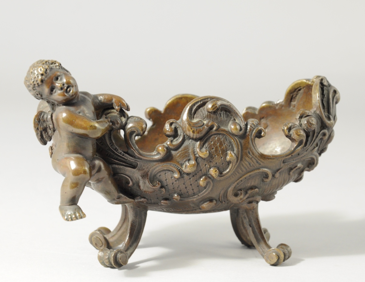 Petite COUPE de forme navette en bronze patiné. Le réceptacle à bords contournés à décor de style Louis XV d'enroulements feuillagés, agrafes, fleurs et quadrillages agrémenté d'un amour en ronde-bosse. Elle repose sur quatre pieds à enroulements. Signée "A. PANDIANI MILANO".