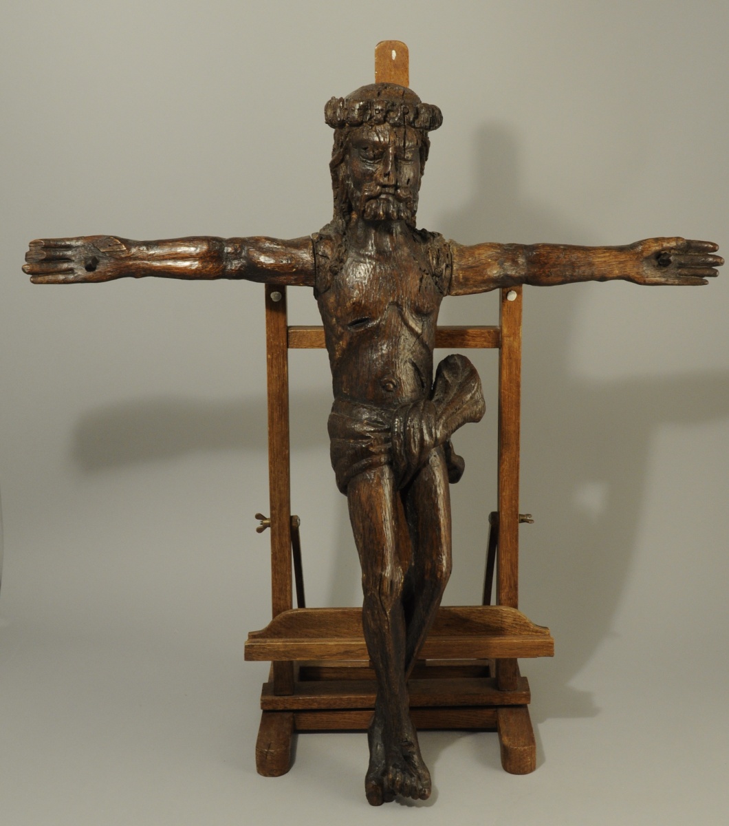 CHRIST en bois sculpté couronné d'épines, le visage apaisé, les bras perpendiculaires au corps. Traces d'enduit.