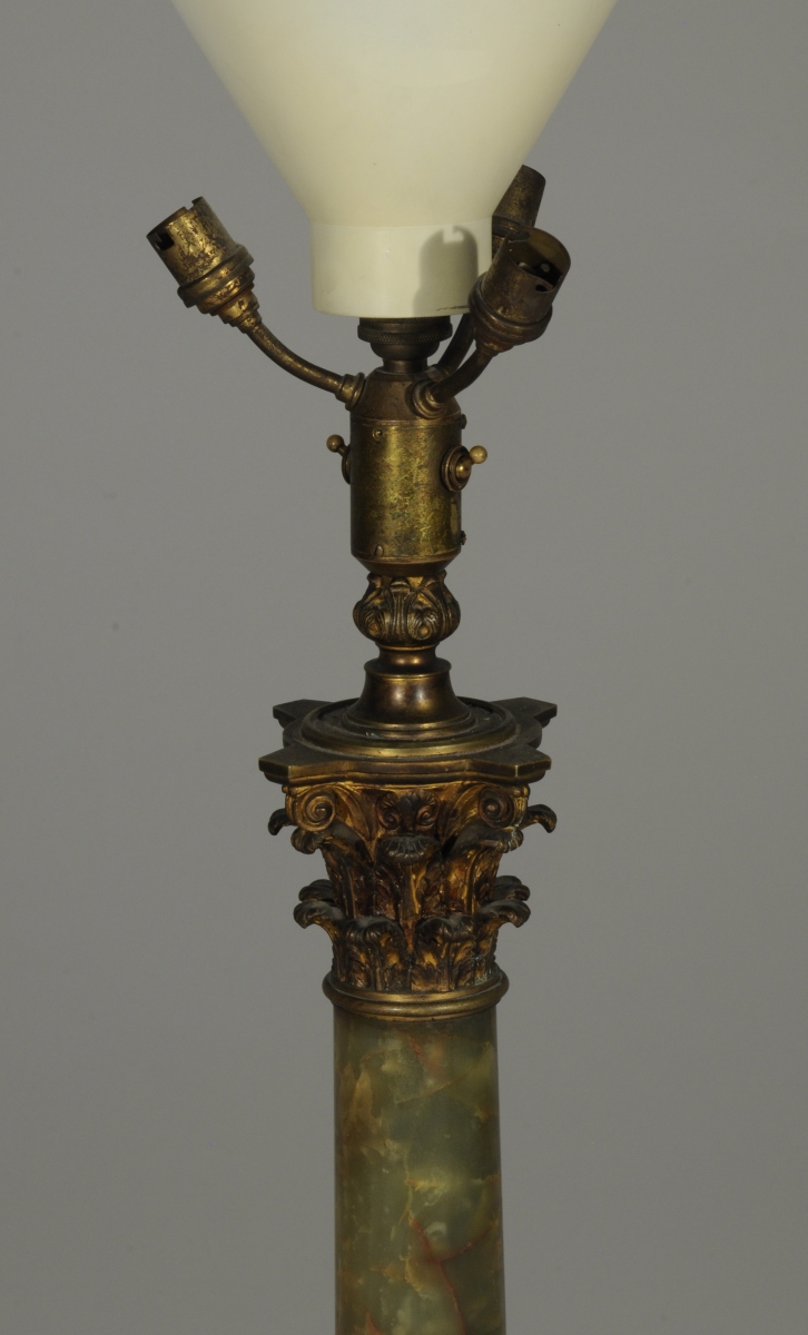 LAMPE à quatre lumières adoptant la forme d'une colonne corinthienne en onyx vert agrémenté d'éléments en bronze doré tels que chapiteau, base en tore de laurier et frise feuillagée. Socle carré en bronze. Repose sur quatre petits pieds boule.