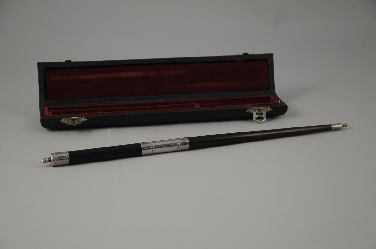 BAGUETTE DE CHEF D'ORCHESTRE en palissandre. Garniture en argent ciselées de frises d'entrelacs. Se démonte en deux parties. Écrin.