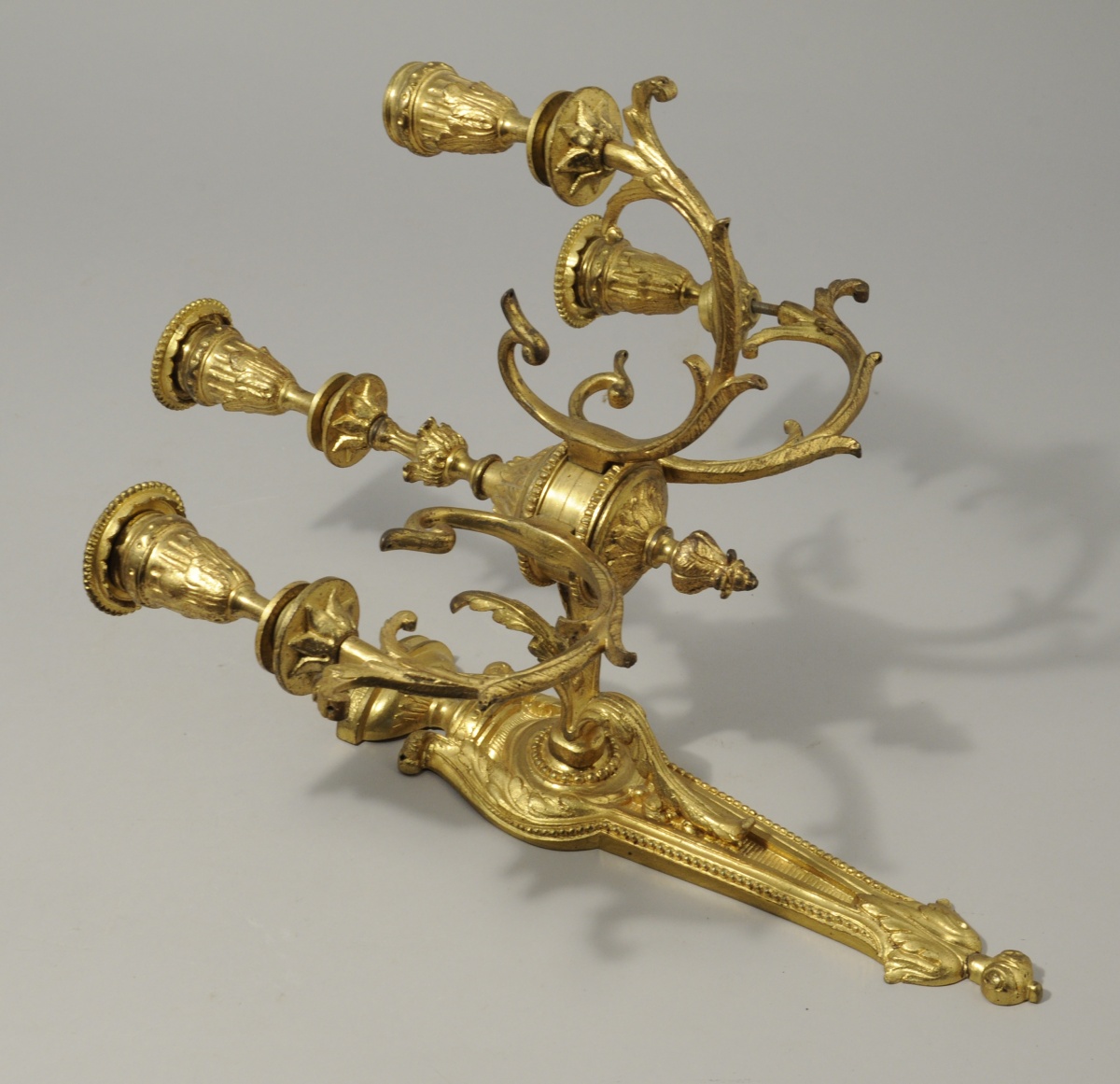 PAIRE D'APPLIQUES à quatre feux en bronze doré. Trois bras de lumières en volute, le quatrième sur fût à l'amortissement. Décor de feuilles d'acanthe stylisées, fleurons, graines, cannelures et rais de perles. Un pot-à-feu à l'amortissement.