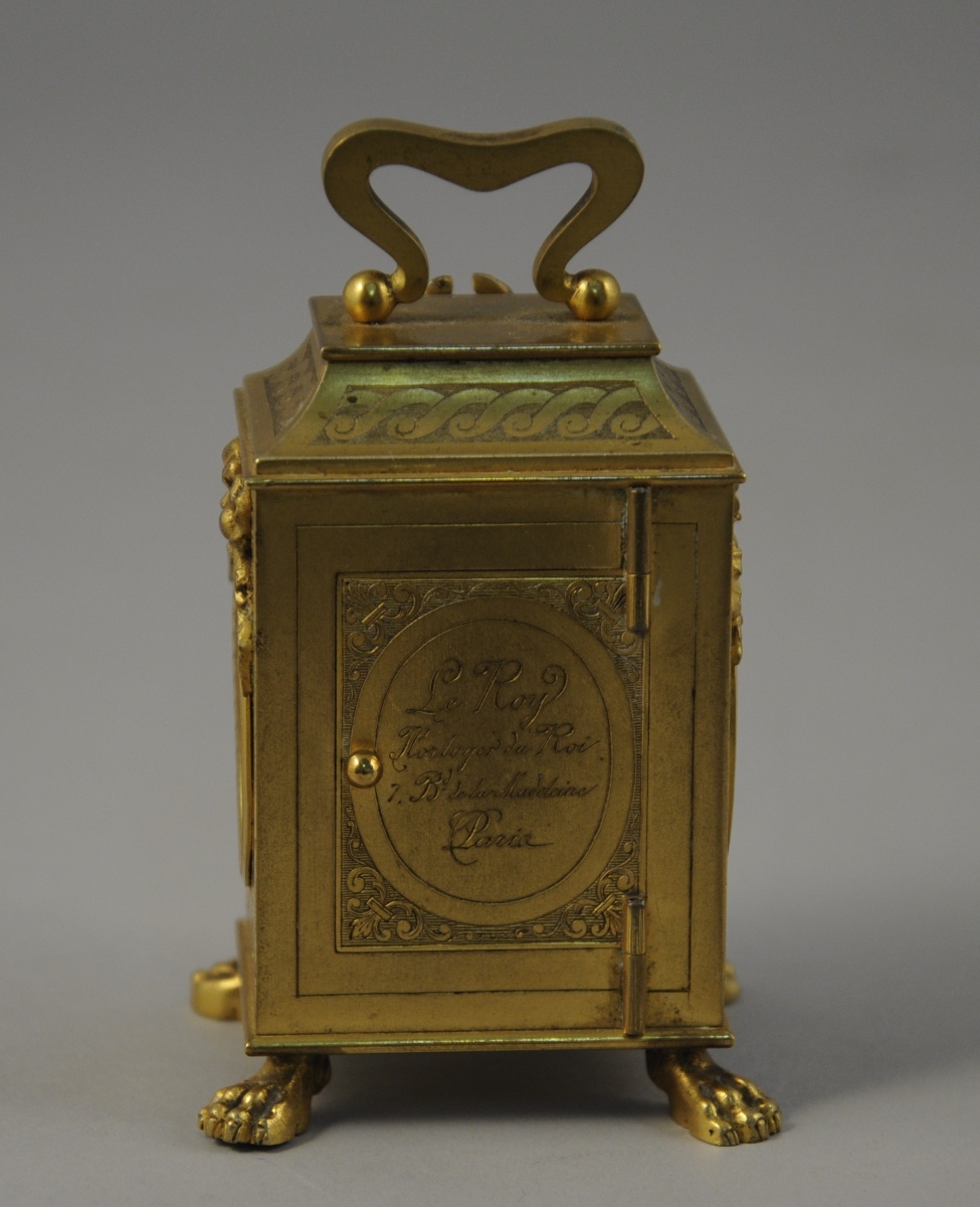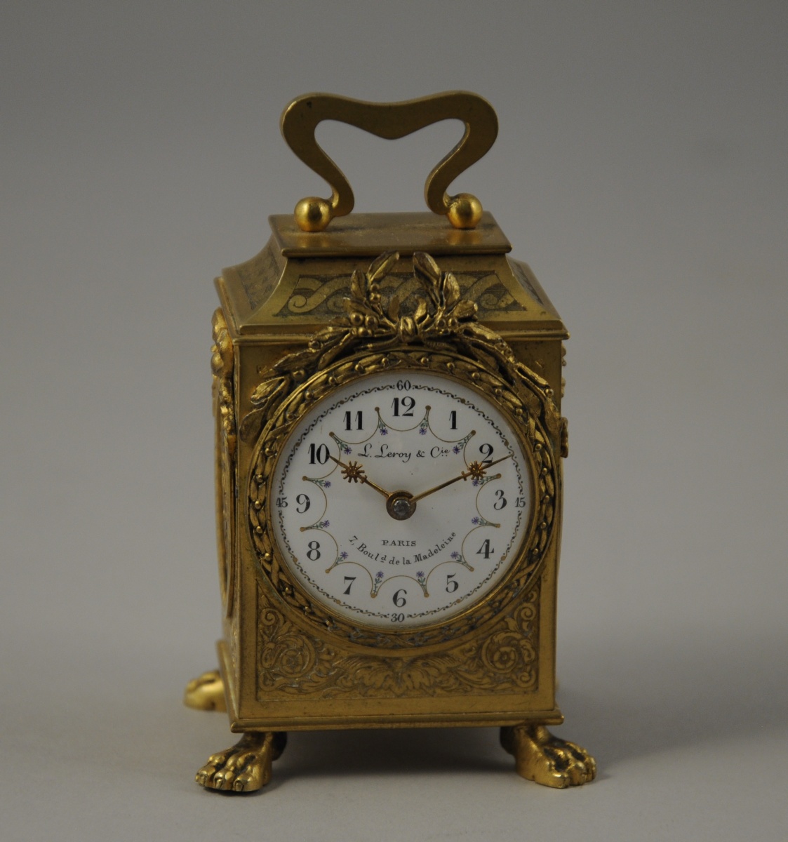 PENDULETTE de forme rectangulaire en bronze ciselé et doré. Décor ajouré de rinceaux feuillagés dans des médaillons rubanés et frises de postes. Cadran circulaire émaillé blanc, rehaussé à l'or et émaillé de barbeaux au naturel indiquant les heures et les quarts d'heure en chiffres arabes. Sommé d'une couronne de laurier. Repose sur quatre pieds en patte de lion. Le cadran signé "L. Leroy & Cie / Paris / 7, Bould de la Madeleine". Le boîtier marqué "Le Roy / Horloger du Roi / 7, Bd de la Madeleine / Paris" et numéroté 20017. Le mécanisme signé "L. Leroy & Cie / A Paris" et numéroté 20017. Clef.