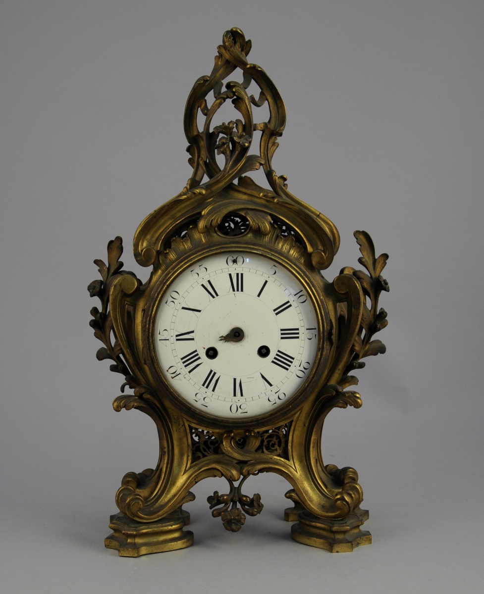 PENDULE en bronze ciselé et doré. Riche décor ajouré de volutes feuillagées, fleurs et enroulements. Piètement quadripode. Le mouvement marqué J.E.D. Clef.