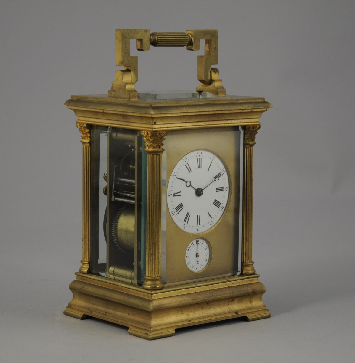 PENDULETTE D'OFFICIER en laiton. Les quatre montants figurant une colonne, cannelée. Cadran émaillé blanc indiquant les heures en chiffres romains et les 5 minutes en chiffres arabes. Réveil avec cadran secondaire en chiffres arabes. Clef.