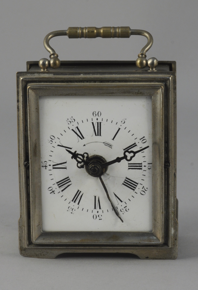 PENDULETTE D'OFFICIER en métal argenté. Cadran émaillé blanc, indiquant les heures en chiffres romains et les minutes en chiffres arabes. Réveil. Signée "C. Maurel à Paris" et marquée "Prix Montyon / TM / Breveté / Médaille d'or".