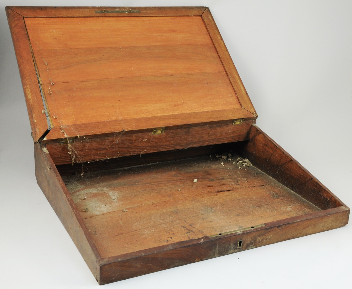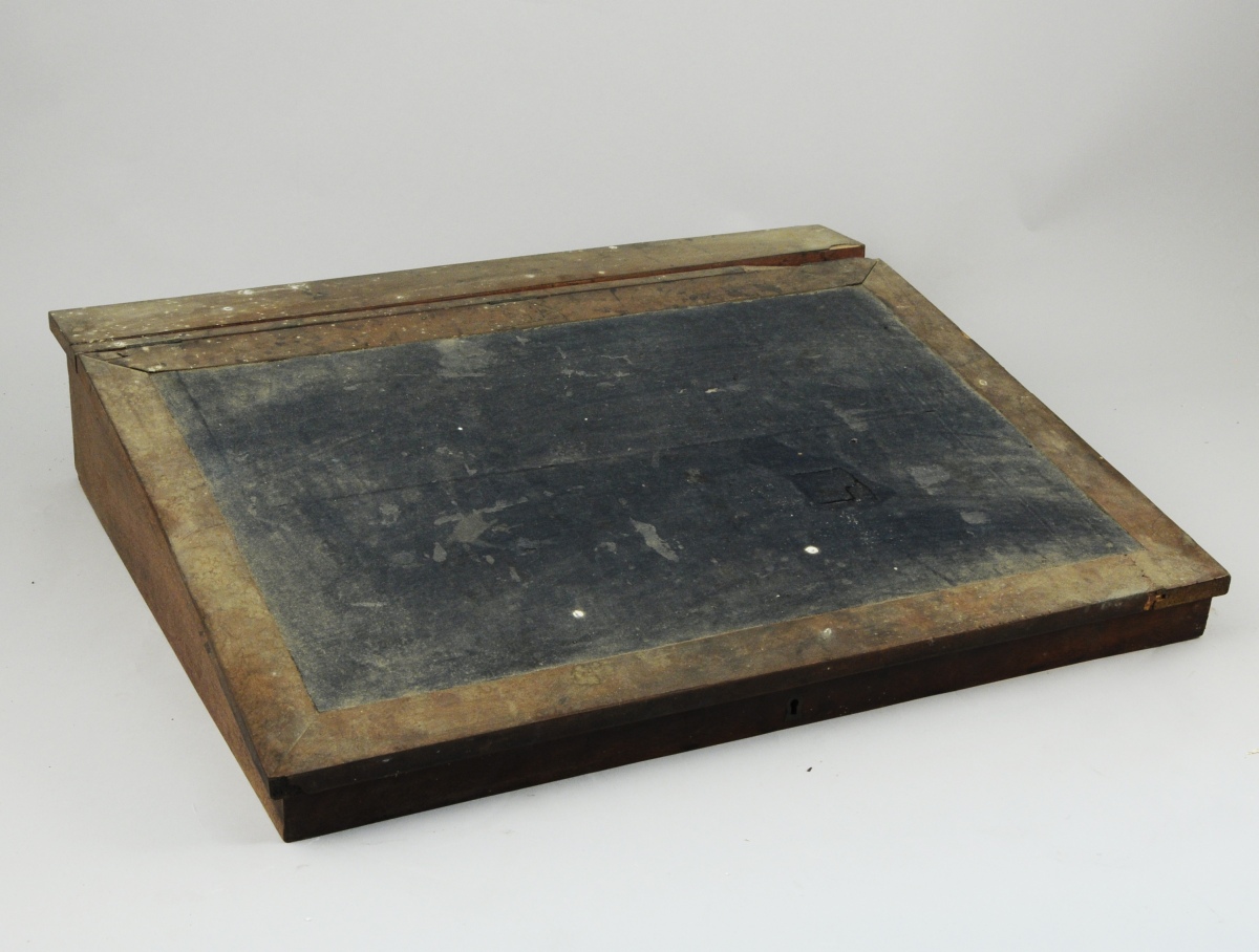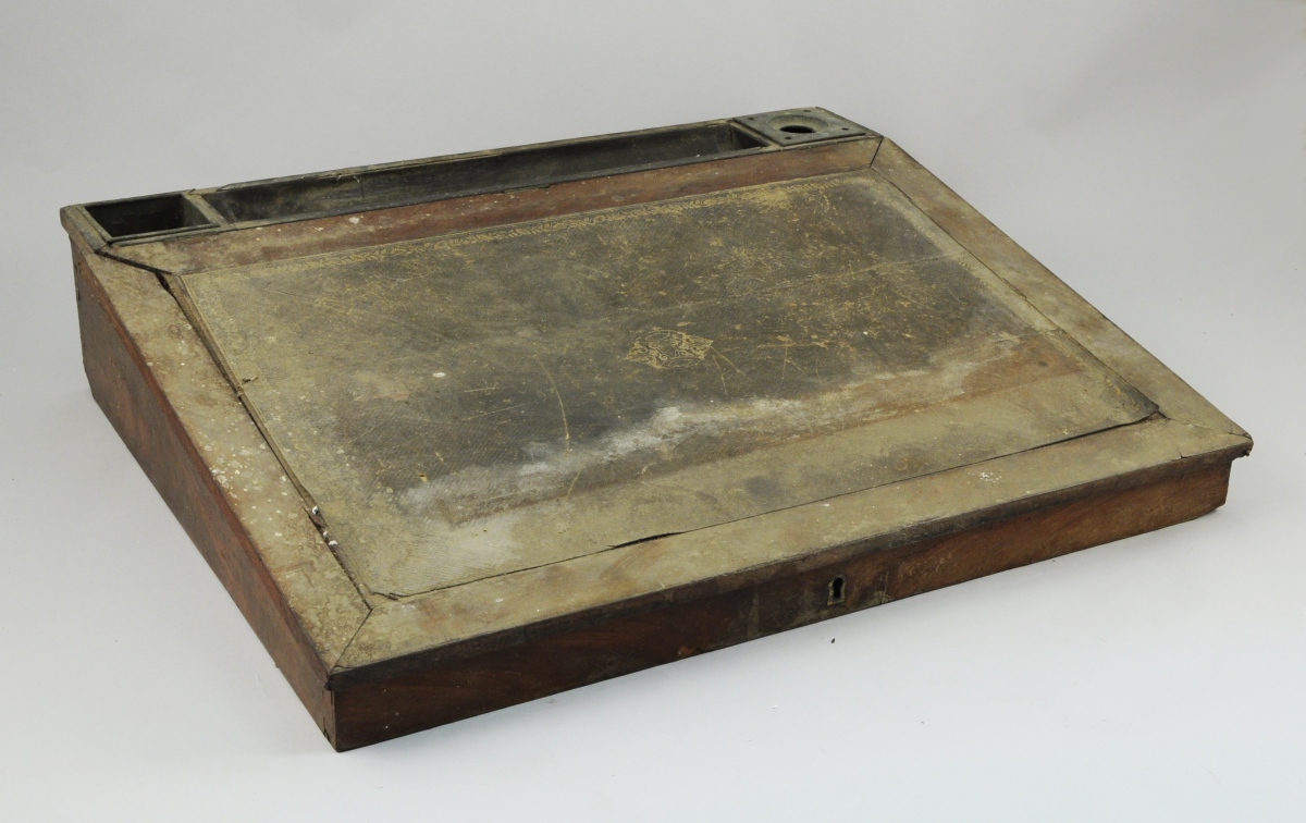 Deux PUPITRES en bois garni de cuir. Abattant découvrant des encriers (dont un en verre) et une cavité.